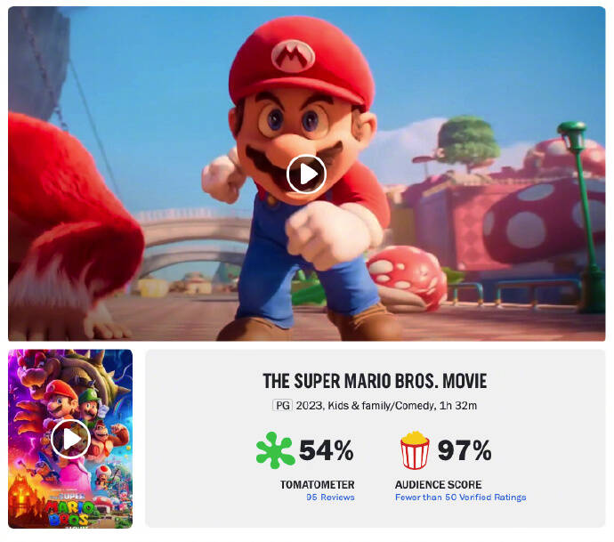 《超级马力欧兄弟大电影》的海外媒体评测现已全面解禁,Metacritic收录35家媒体评价仅打出49分;番茄新鲜度54%,爆米花指数97%。