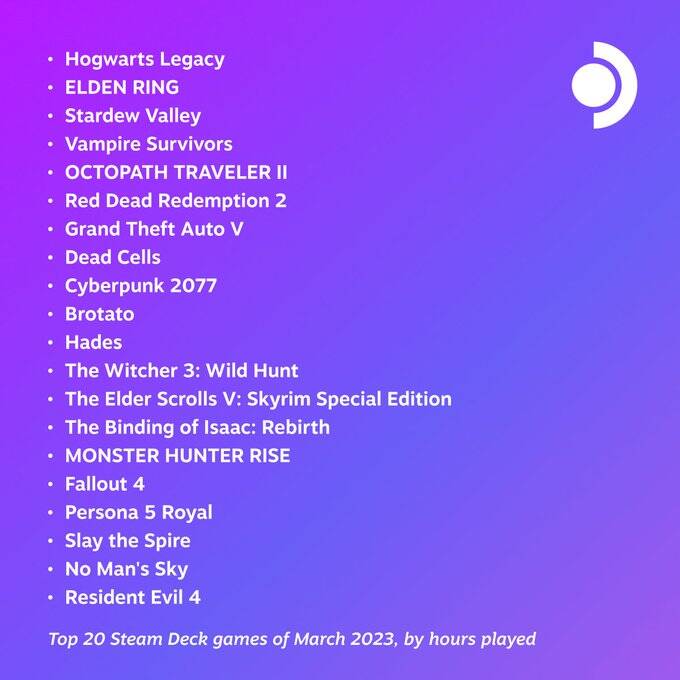 以下是 Steam Deck 上 3 月排名前 20 的热门游戏,按游戏时间排序。