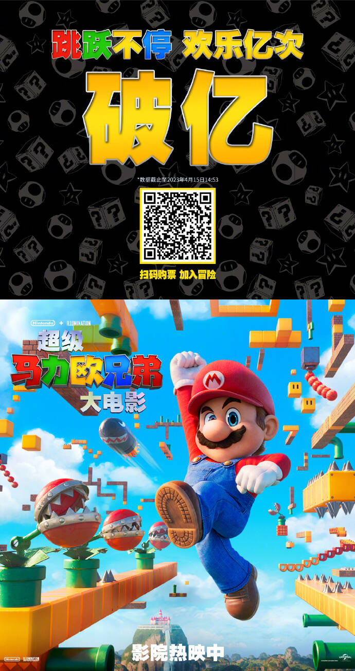 《超级马力欧兄弟大电影》全球票房已经突破5亿美元,国内票房上映11天突破1亿人民币.