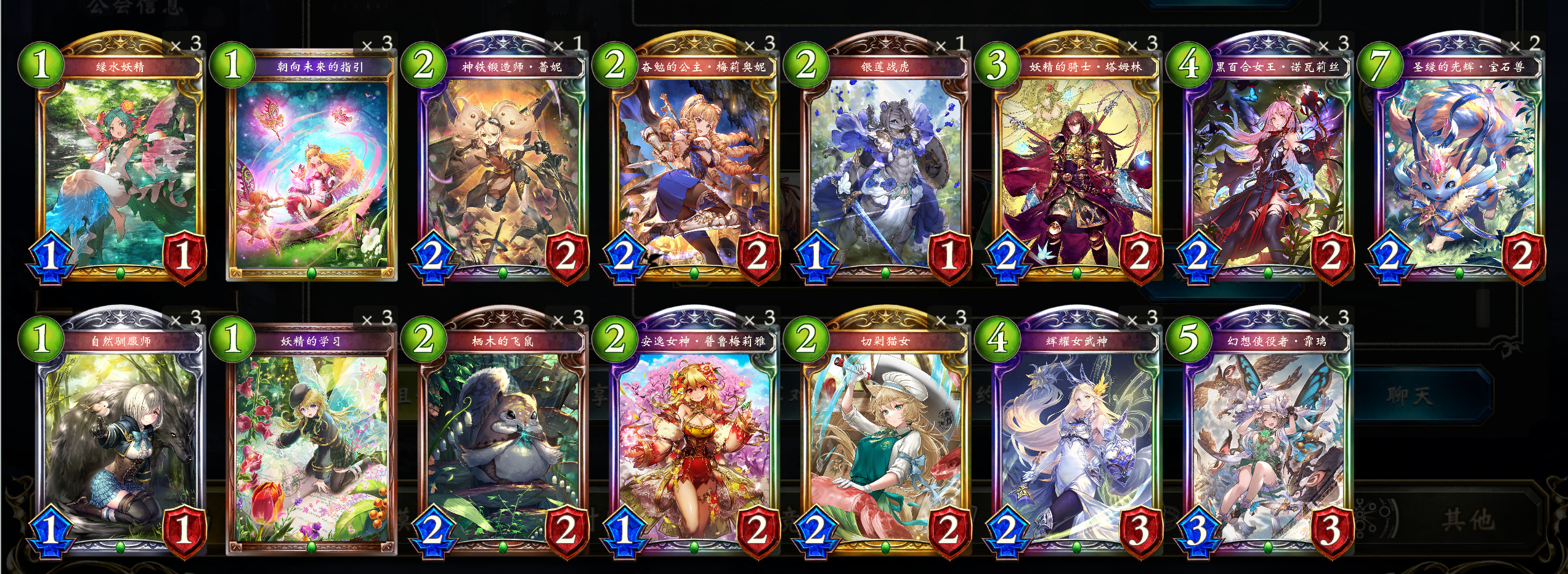 虽然在JCG Shadowverse Open 25th Season Vol.9(4/12)指定大赛的一位四强的妖精卡组中,同时携带了爱丽丝、霏璃、无声铃鹿,没有携带小可爱而带满妹妹,但是那一套就不予贴出来了。
