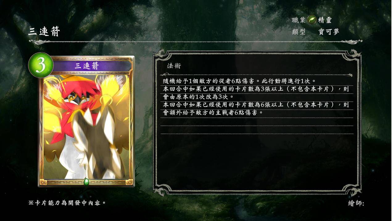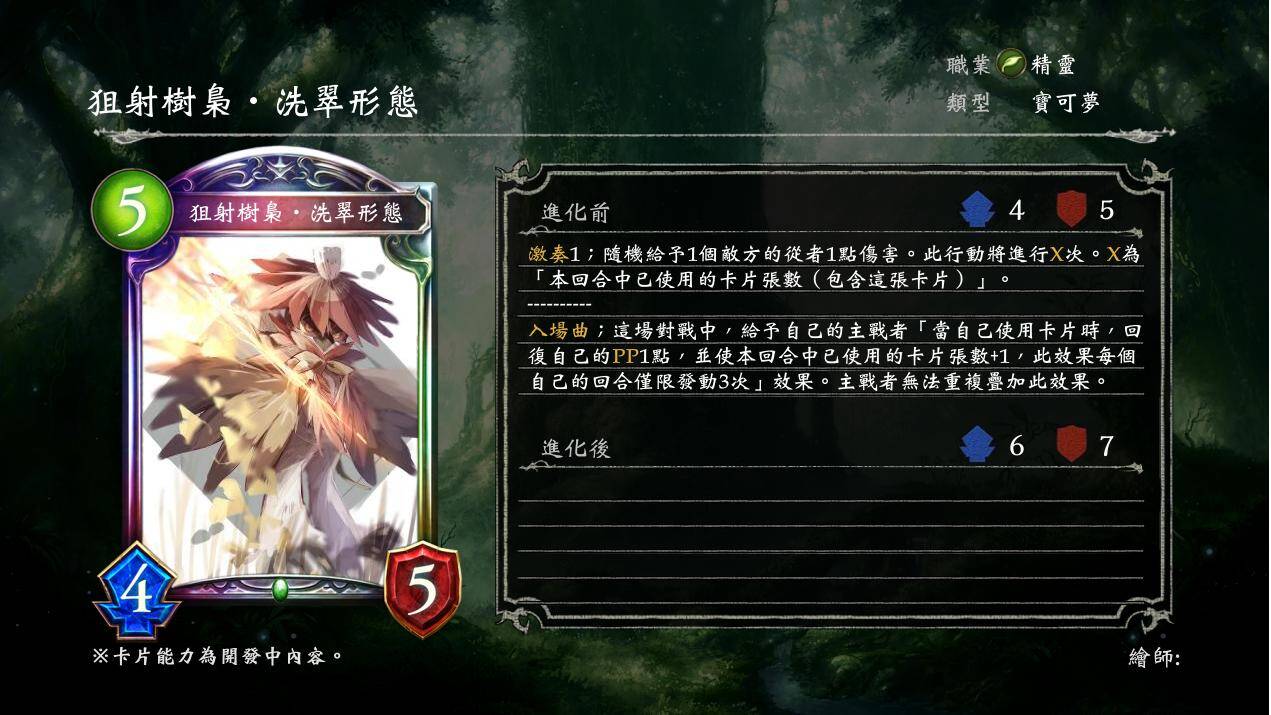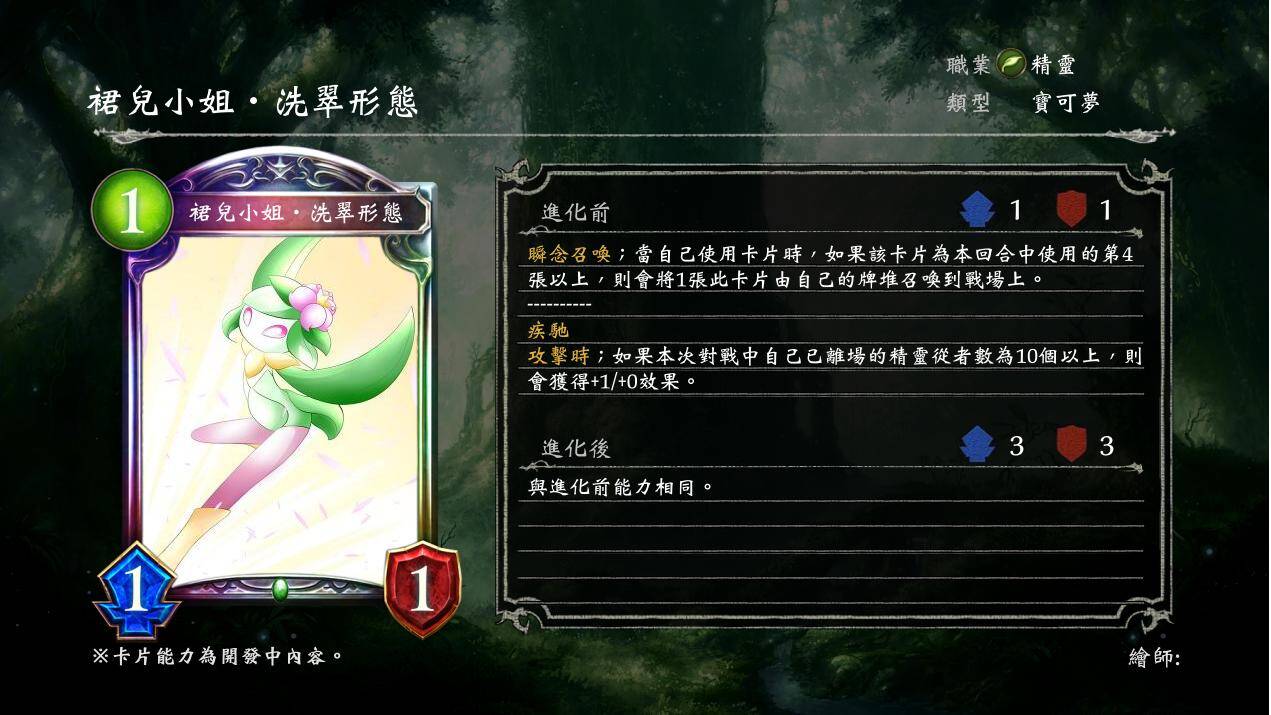 设计想法:瞬念的想法参考了森林游侠·维尔达,没有像之前的一些四连击瞬念一样只能是第四张卡是因为这样做会和上面的狙射树枭的buff冲突导致跳不出来,整体的思路就是用简单的效果制造一张强度很高的卡,对应了洗翠裙儿小姐外表纤细但攻击很高的反差。