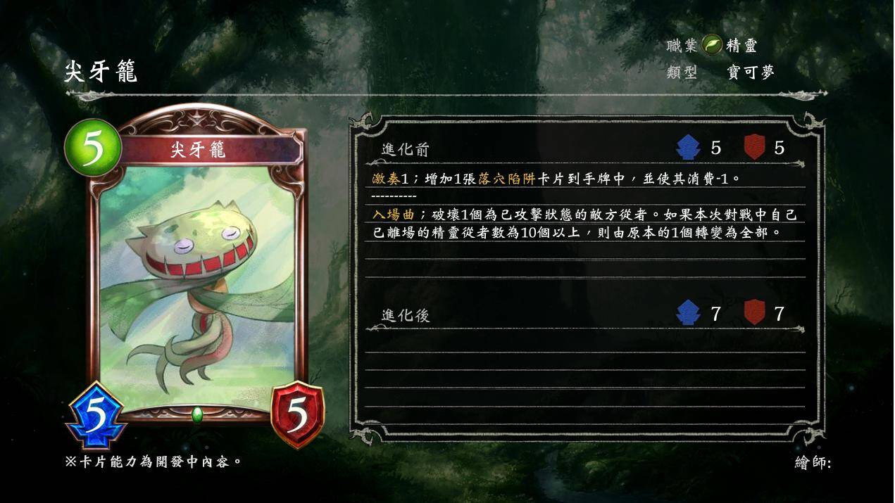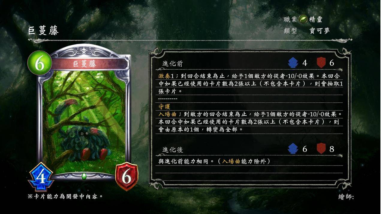 设计思路:整张卡的设计灵感来源出自于缠绕树藤这张卡,无论激奏还是本体。整张卡作为一张防守卡也对应了巨蔓藤物理盾的定位。