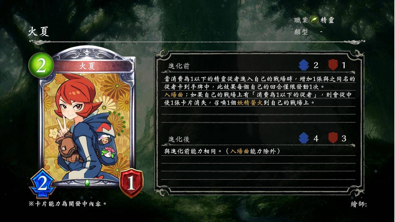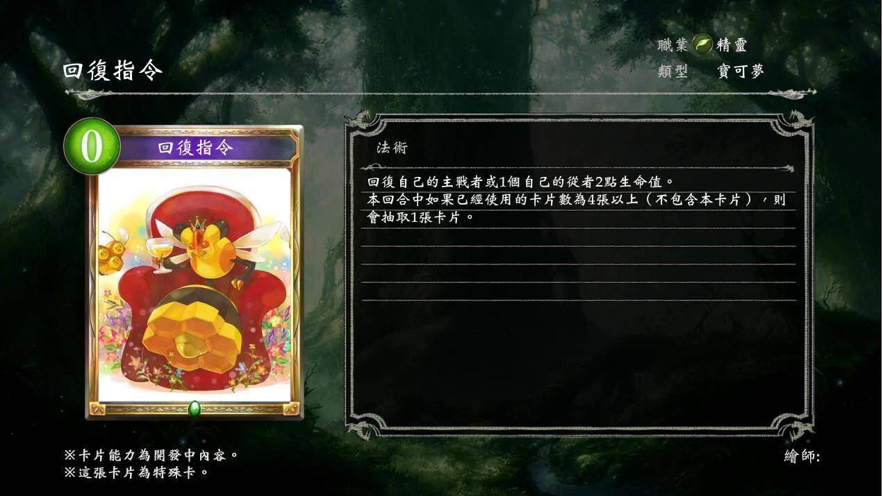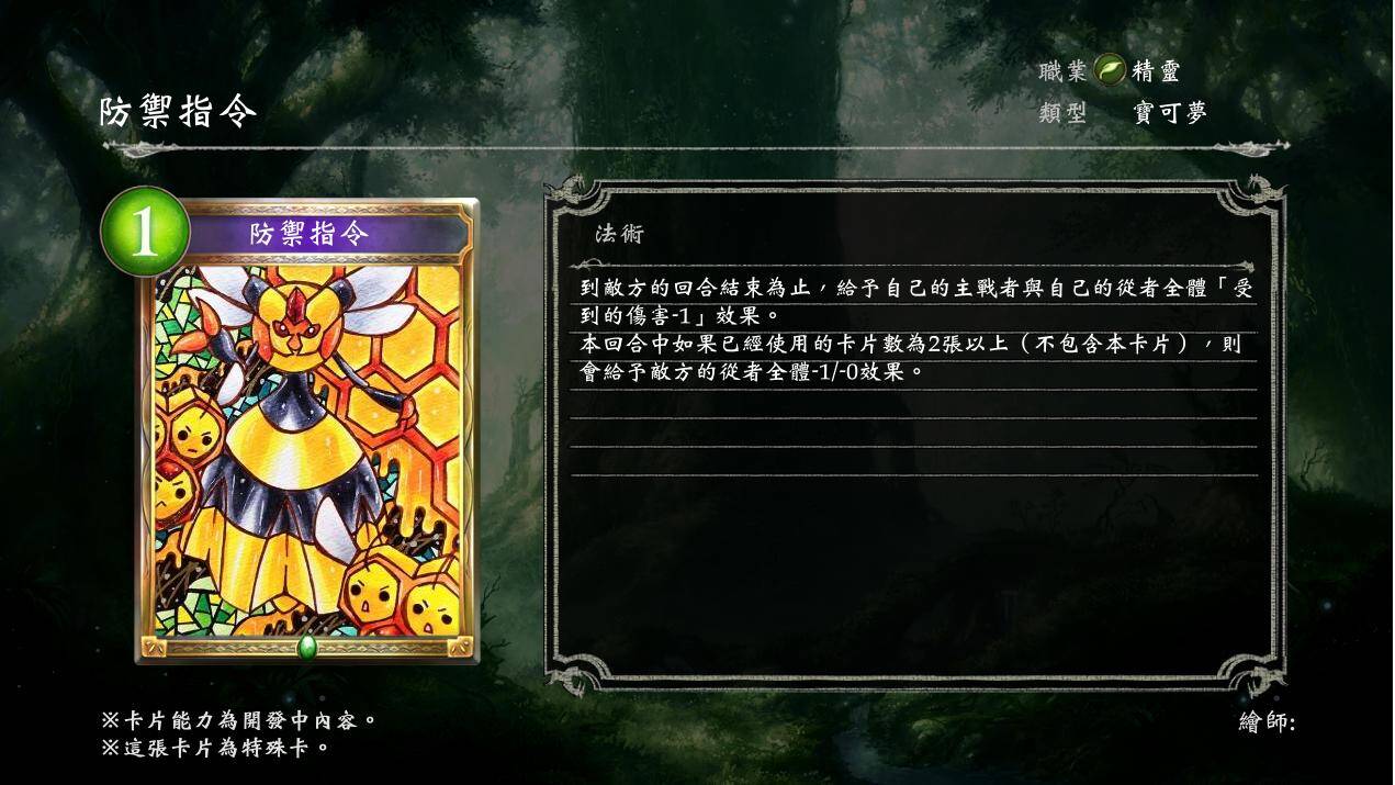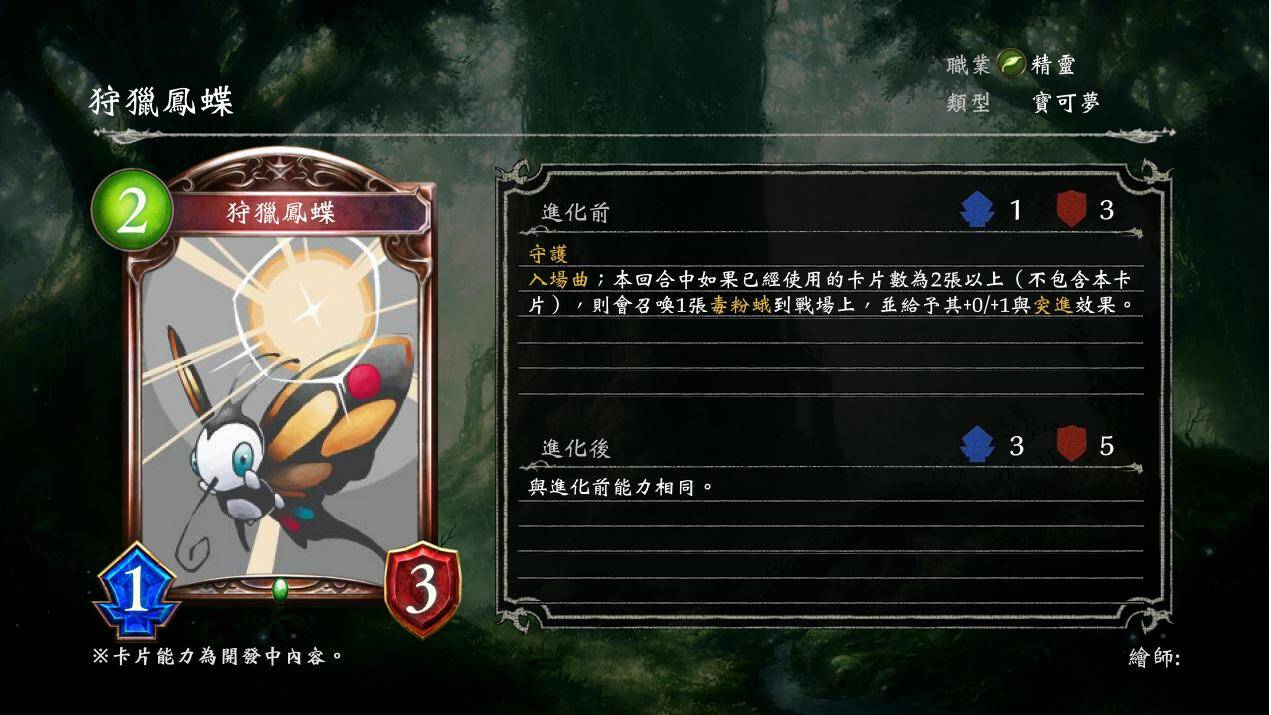 入场曲;本回合中如果已经使用的卡片数为2张以上(不包含本卡片),则会召唤1张狩猎凤蝶到战场上,并给予其+1/+0与「下一次受到的伤害转变为0」效果。