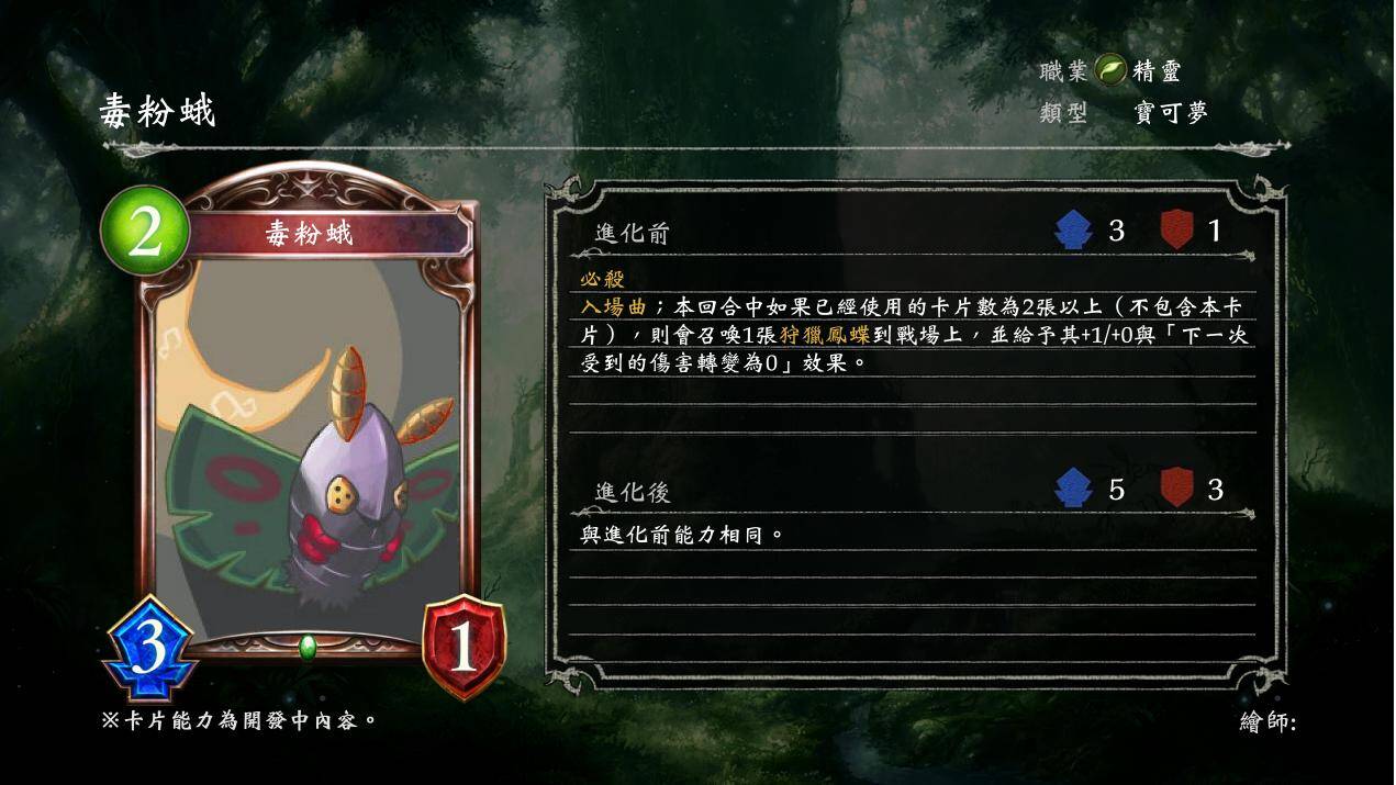 入场曲;本回合中如果已经使用的卡片数为2张以上(不包含本卡片),则会召唤1张毒粉蛾到战场上,并给予其+0/+1与突进效果。