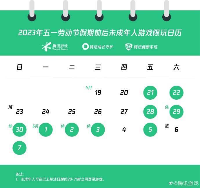 腾讯游戏今天公布了2023年五一劳动节假期前后未成年人游戏限玩通知和限玩日历。
