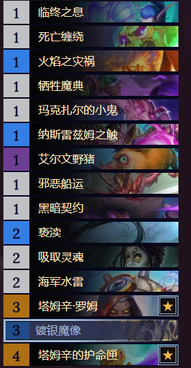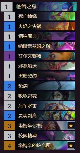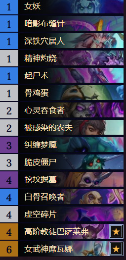 版本选择:有猪的暴风城和有**的沉默之城必有,狗头人与地下世界、冰封王座、贫瘠之地、卡拉赞的弃牌、核心;奥丹姆的牌很差,只有一张火焰之灾祸有用,但是出村和打大哥德需要灾祸这张牌,自己考量着带不带;如果不想要沉没之城的话,可以把**换成221亡语打3。