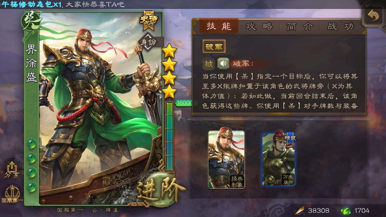 作为阴间武将,界徐盛总是被玩家批评。然而当自己武将选择中有界徐盛时,全然不顾哪些鄙视,直接秒选界徐盛。一刀下去2滴血,【酒】【杀】3滴血,装备【古锭刀】使用酒杀,一次性就是4滴血,那种秒人的快感最令人兴奋。