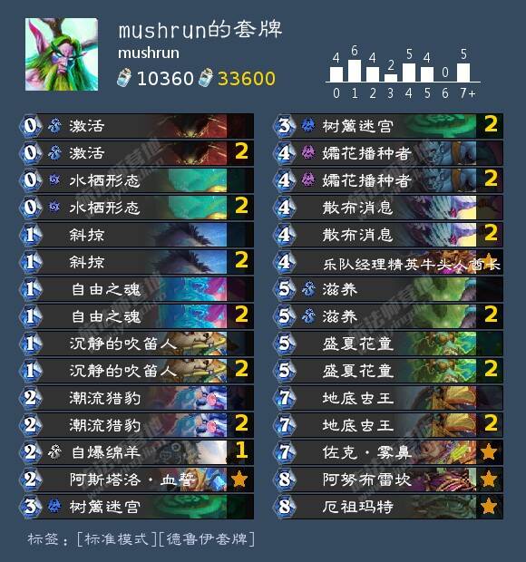 1.厄祖玛特(章鱼巨型):个人认为的最强卡牌,合了绝对不亏!可以很好地处理对于德鲁伊来说很难处理的大怪或者小随从铺满的场面,比如瞎子的一堆突袭小怪或者奇迹贼的地标大随从,用来打内战的德鲁伊更是爽飞,简直神卡!但是,由于巨型+6的缘故,会导致自己没格子这一点需要特别注意!非常容易被冰dk的冰龙以及血dk的血液沸腾克制。但是这种情况可以把只剩一点耐久的地标点掉,或者用卡组里自带的斜掠来处理。