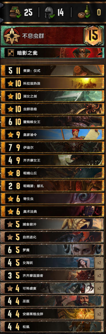 虫群思维和齐齐摩追猎者都变成非核心卡,整体解牌变弱了,点数上限也变低了,不过也在在接受范围内,打普通自闭卡组也够用。
