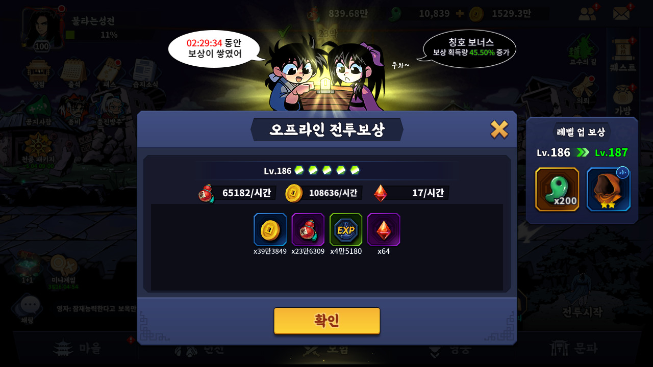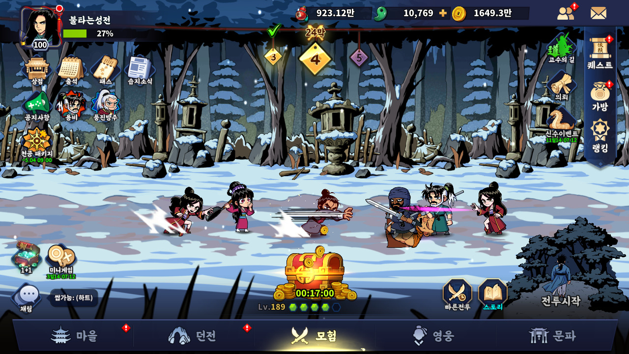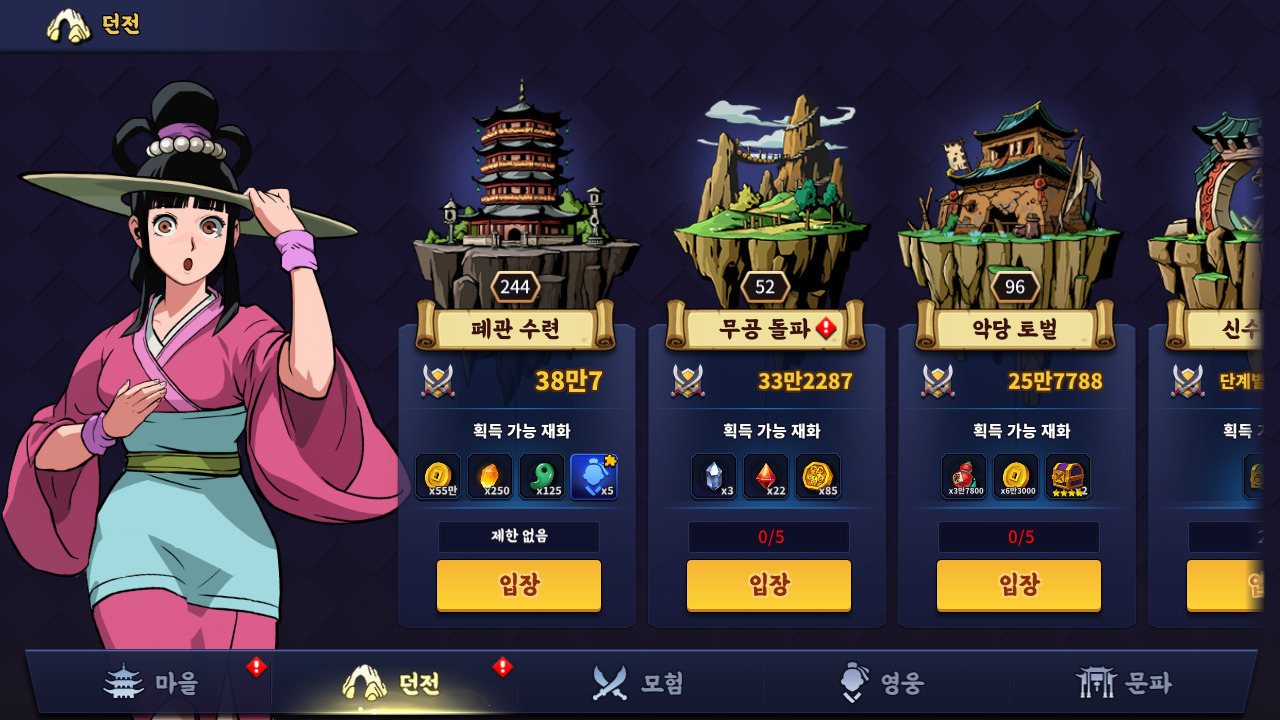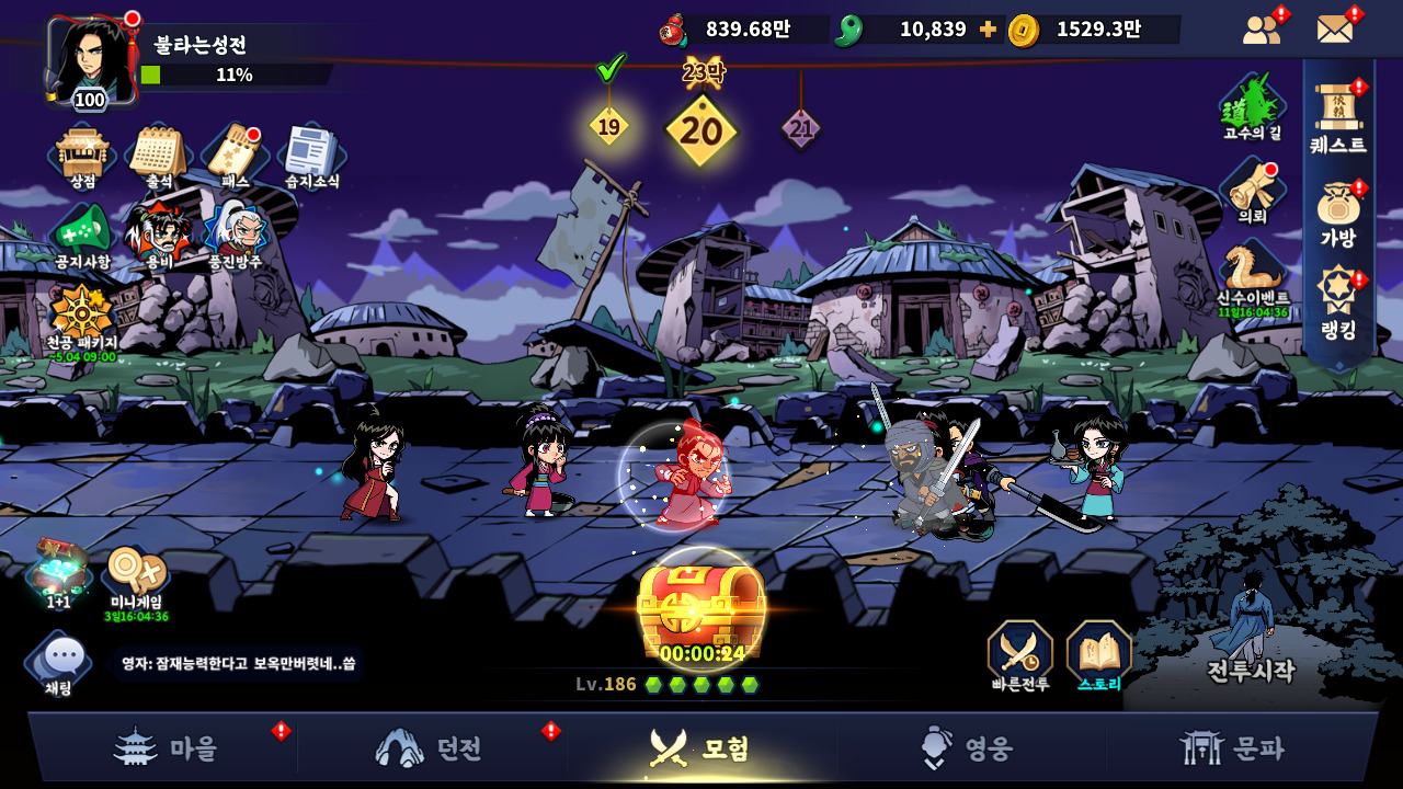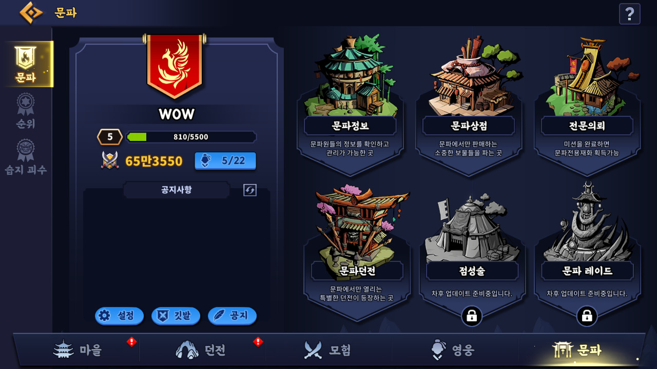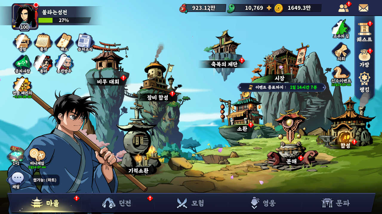 主界面比较整洁,下排有村庄,副本,冒险,英雄,门派功能界面