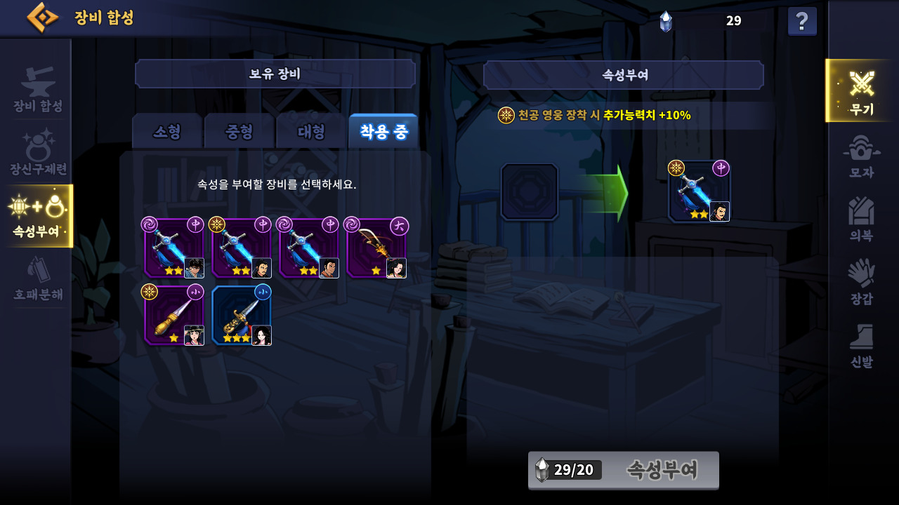 武器可进行属性附魔。选择英雄身上佩戴的武器后,进行附魔。 (如内功英雄佩戴时提升追加能力值10%)