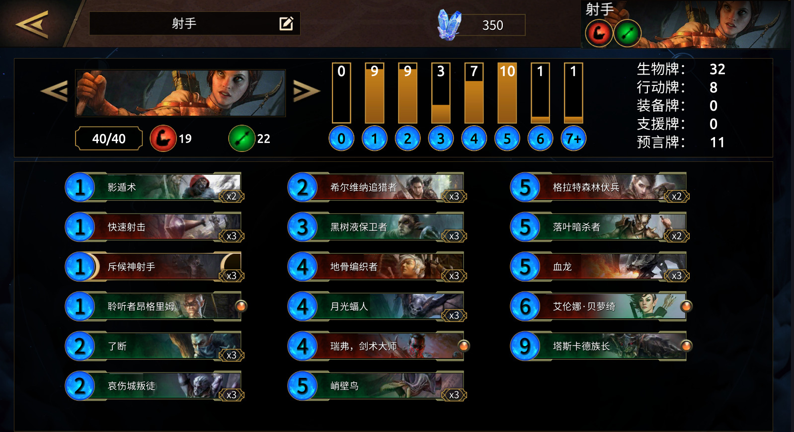 卡组整体是偏快的。但射手职业在偏快的同时,得益于大量的单点伤害与诸如了断、落叶暗杀者的配合,具备着相当不错的解场能力,这使得射手在对阵其他快攻的时候,可以在依靠各种解场组件击杀对面生物的同时完成战场,在将对方资源消耗到一定程度后进行反攻。而对抗较慢的卡组可以利用哀伤城叛徒等生物快速抢血,用点伤配合西尔维纳追猎者迅速积累伤害。