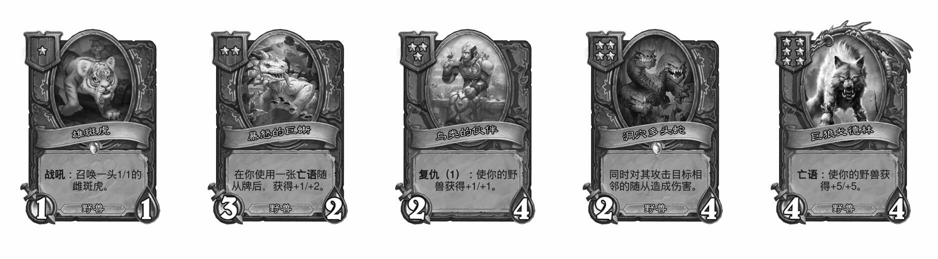 - 1星4/1野兽,亡语:召唤两个0/1并具有嘲讽的Cublings