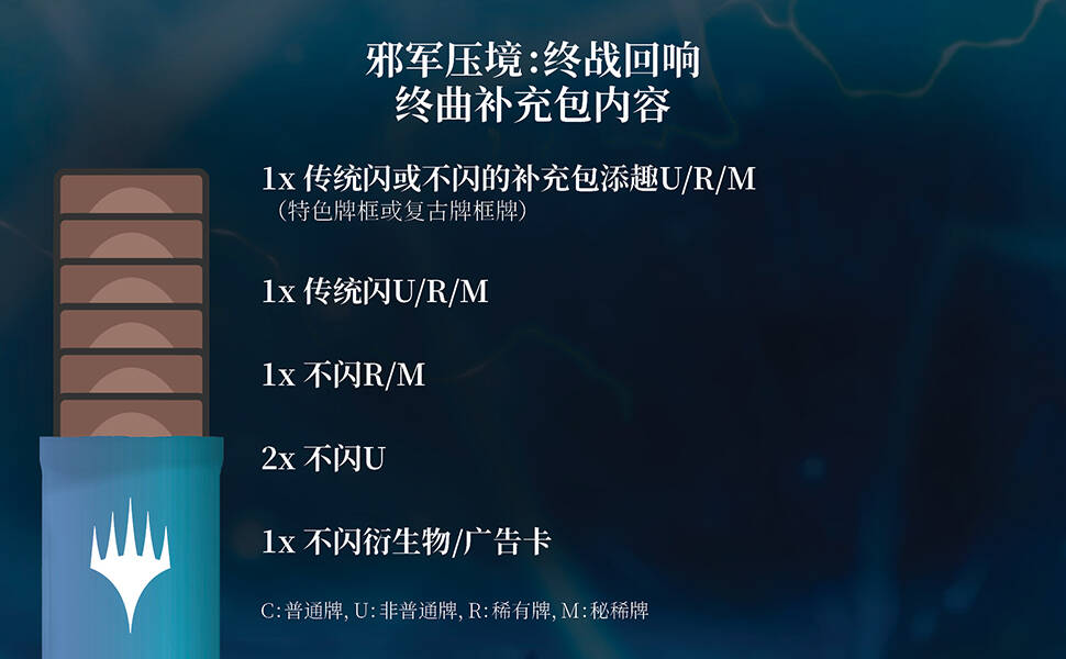 终曲系列是袖珍系列,因此终曲补充包内的牌张数量也会减少。终曲补充包内含五张牌:
