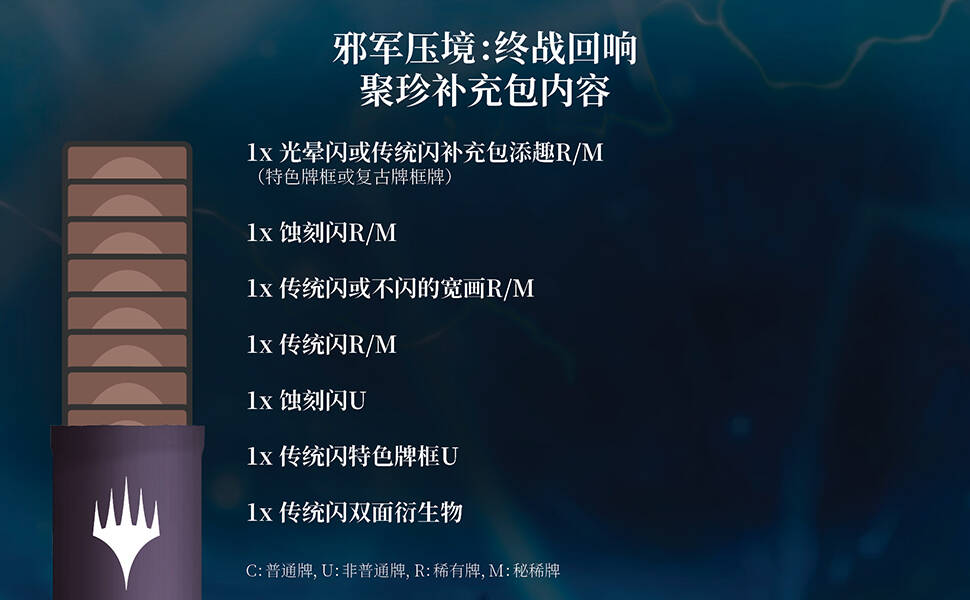 蚀刻闪牌也会回归终战回响:本系列中的全部50张牌均有蚀刻闪版本,并配有常规牌框版的插画。光晕闪、蚀刻闪和宽画牌均为邪军压境:终战回响聚珍补充包专享。(限量编号牌不会出现在邪军压境:终战回响系列中。)
