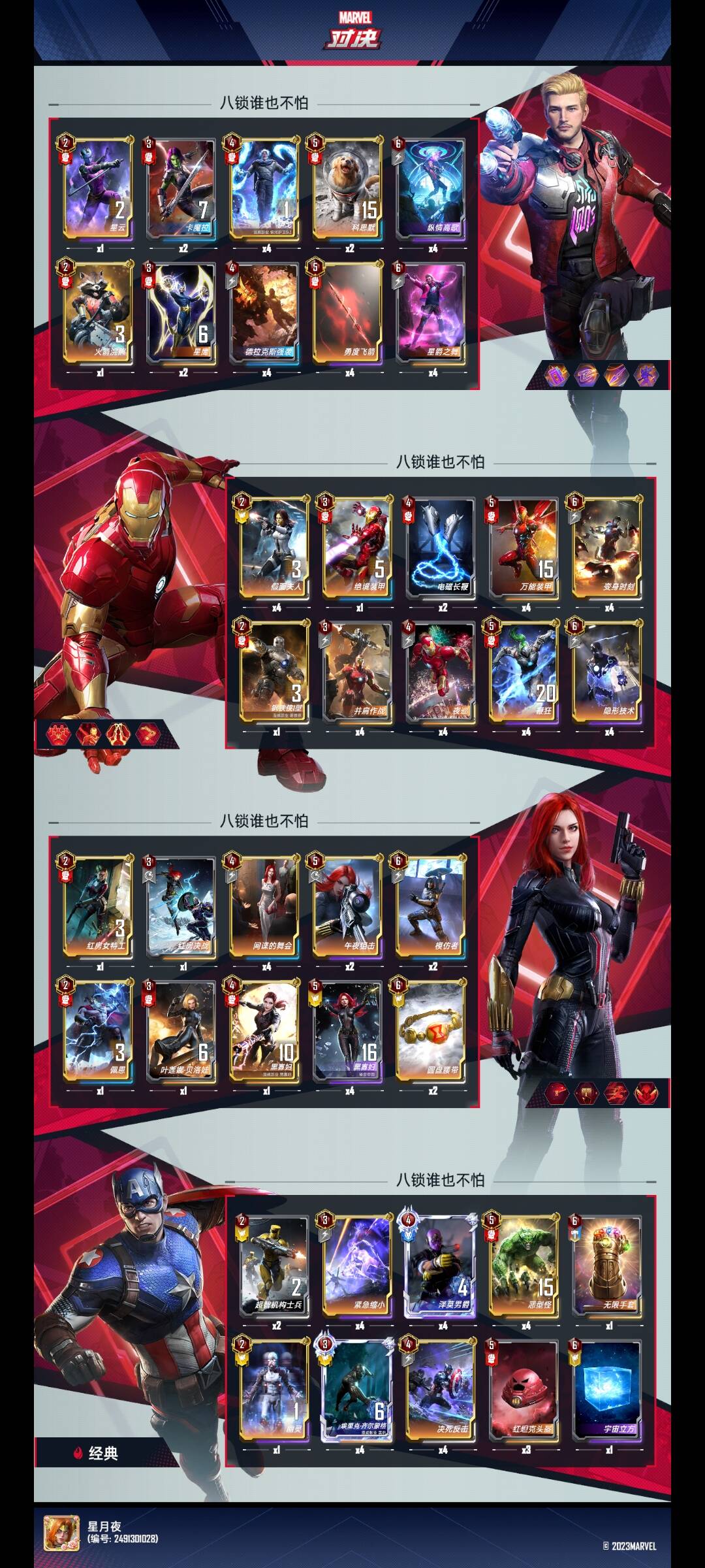 但是携手和移动这两个技能并不容易拿到,那就要想别的思路,此时沉寂已久的八锁技能登场了,星爵除了携手还有三个八锁技能都带,4本就要带伊戈,3本我选择带两张卡魔拉过渡锁血,然后上四本找伊戈。