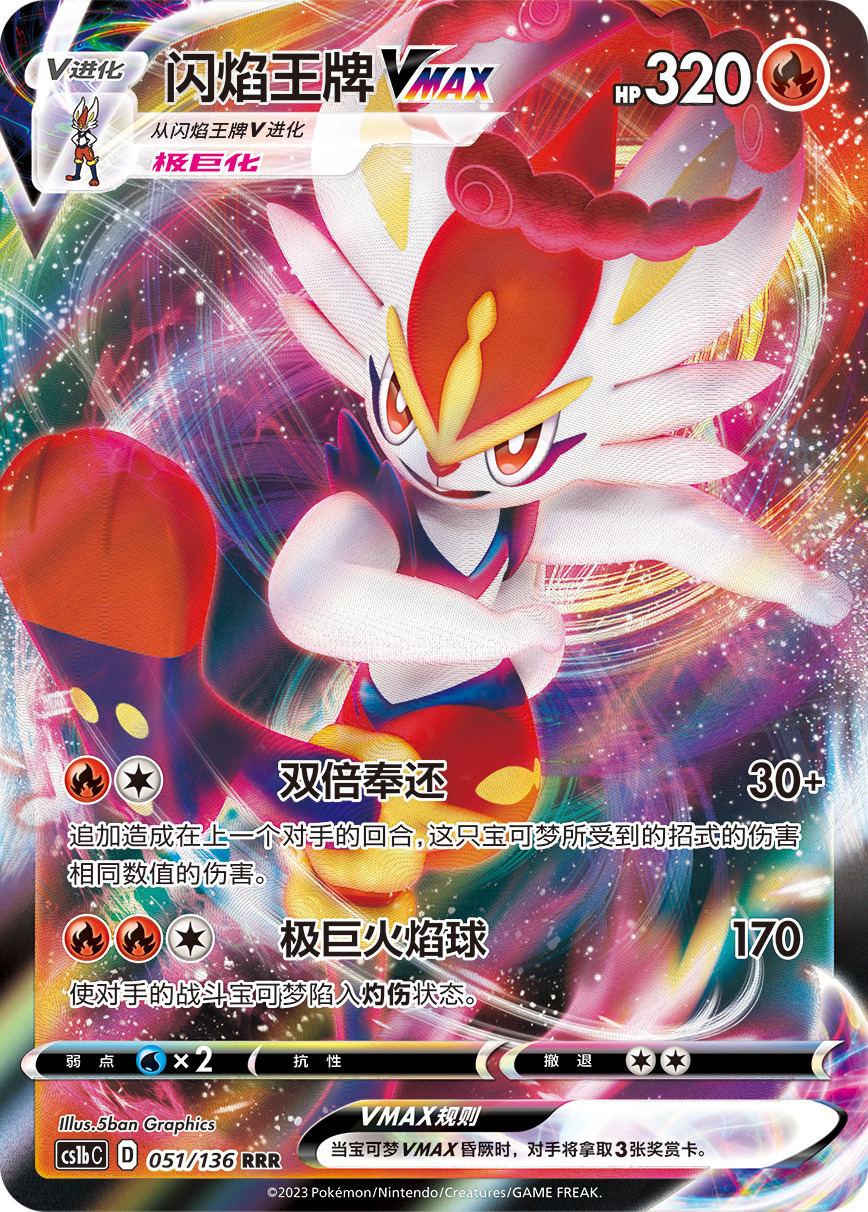 而进化后的闪焰王牌VMAX则拥有强大的进攻能力,【双倍奉还】可将上回合受到的伤害+30点返还给对方,配合自身高达320点的HP能将该招式发挥到极致。