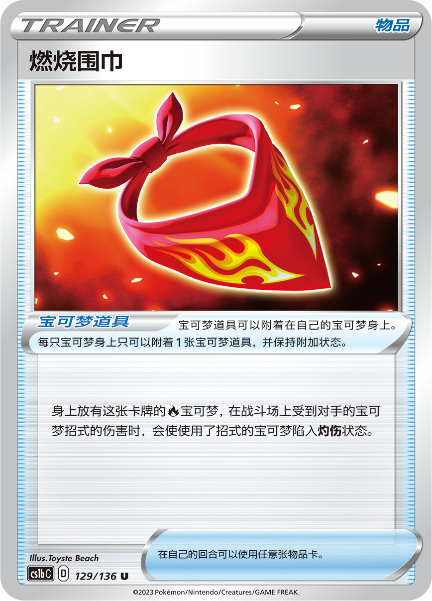 燃烧围巾是一张攻守兼备的宝可梦道具卡牌。如果战斗场上的火属性宝可梦身上放有燃烧围巾,那么在其受到对手宝可梦伤害时,会让对手宝可梦陷入【灼伤】状态。尝试放在你的火属性宝可梦身上,让对手进退两难吧。