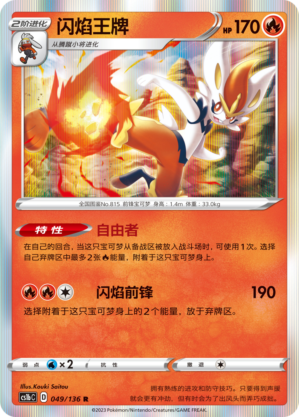 闪焰王牌的招式【闪焰前锋】可稳定造成190点伤害,虽然发动后需要将2个能量放于弃牌区,但当闪焰王牌被从备战区放入战斗场时,可通过特性【自由者】将丢弃的火属性能量重新附于身上。