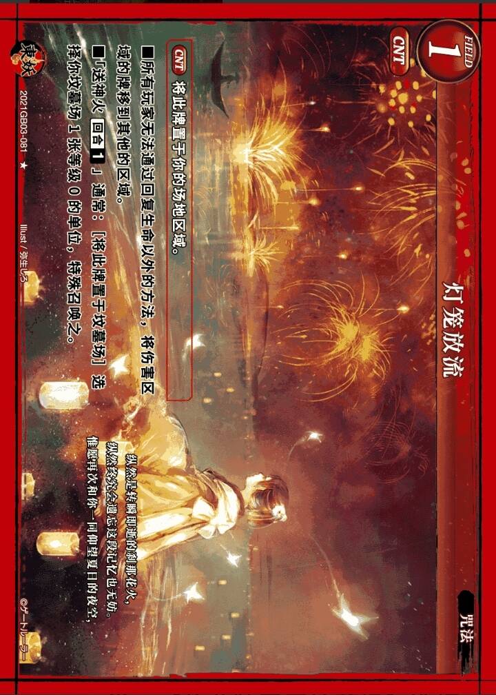 规则:CNT:将此牌置于你的场地区域。 ■所有玩家无法通过回复生命以外的方法,将伤害区域的牌移到其他的区域。 ■「送神火【回合1次】」通常:[将此牌置于坟墓场]选择你坟墓场1张等级0的单位,特殊召唤。