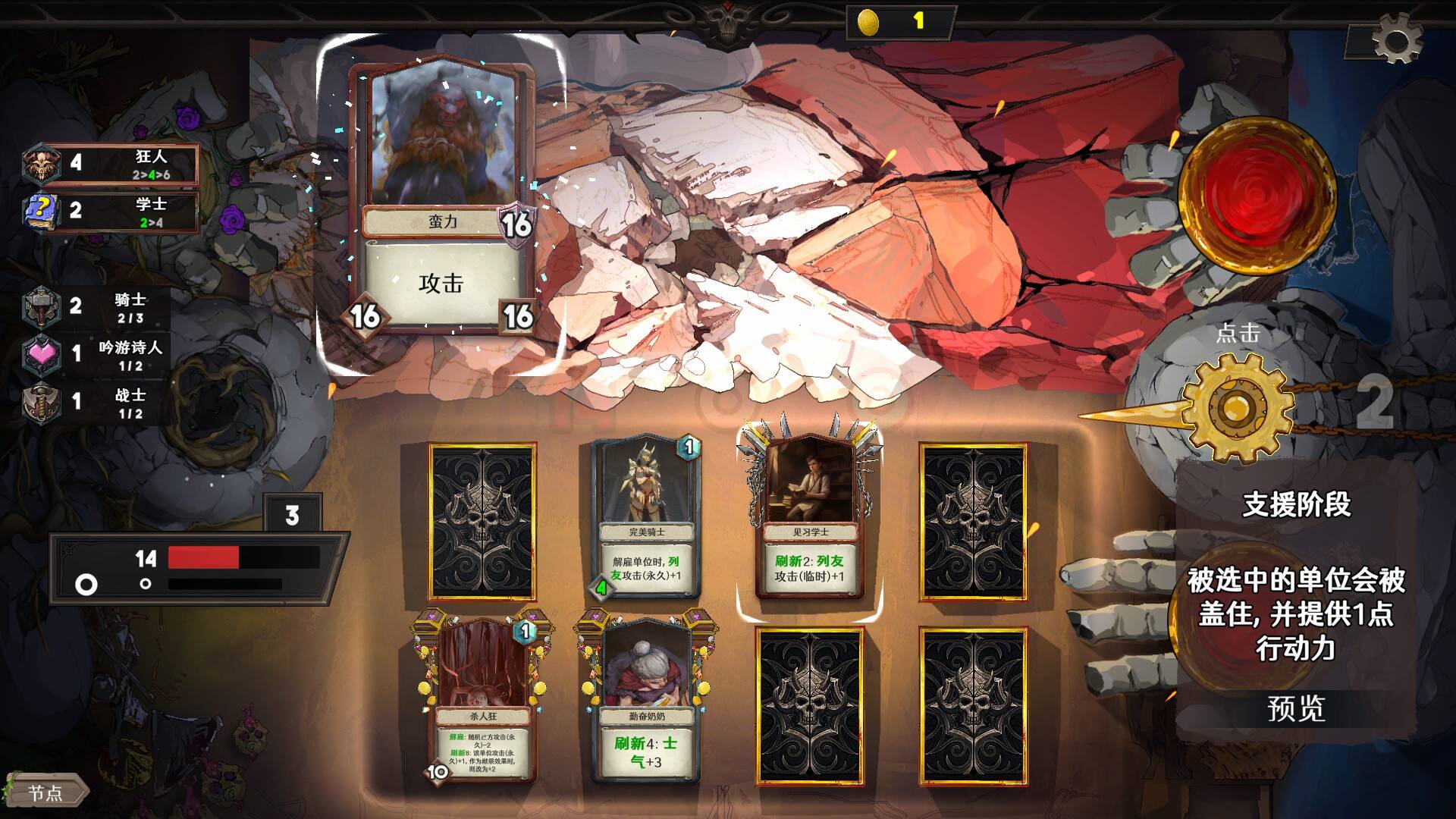 难度的来源来自于战斗。本作的战斗还是相当有新意,有不少值得一提的部分,首当其冲的是在“抽牌”方面,我方是一个固定8张卡的卡组(如果不足8张会用0负重1攻击力的基础卡填充),然后每回合开始时随机翻出3张卡,翻出的卡是“可用”的,但出了辅助卡(包含所有的防御类卡),绝大部分攻击类卡牌都会需要“盖牌”(让某张卡牌跳过本回合)来获取费用。