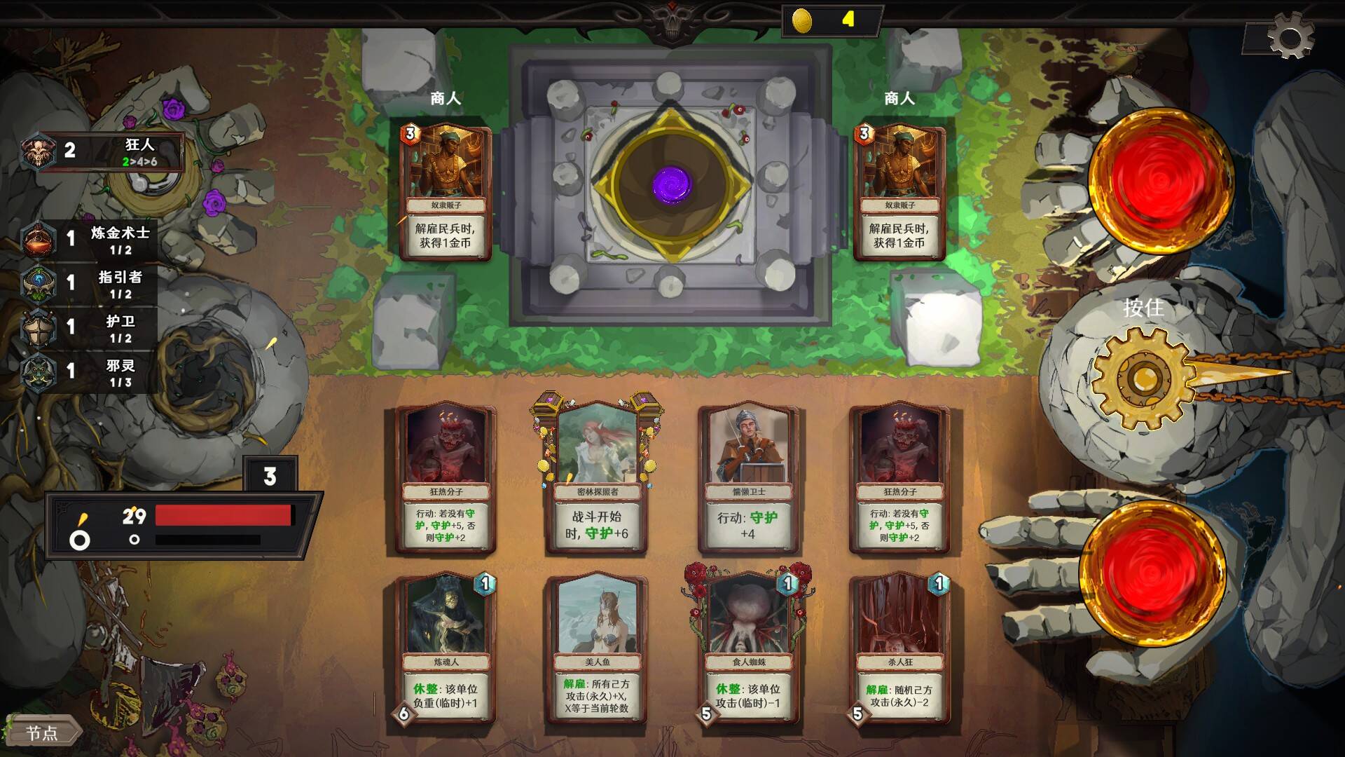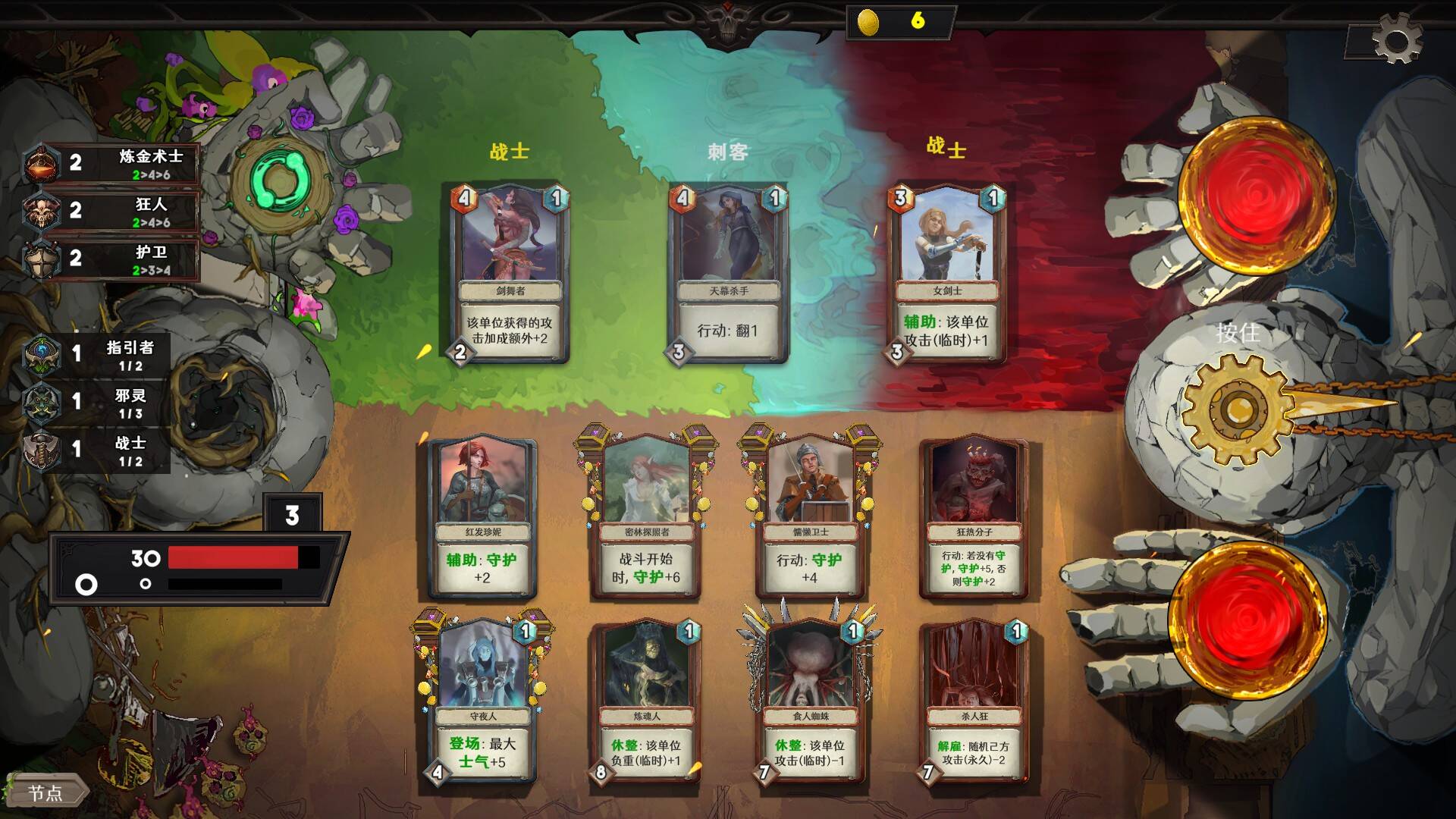 同时需要保护自己的30点血量,事实上这个血量从第3圈开始就随时会面临满血**——比如1圈16伤的石头人、双击的牛头人等等。每圈结束血量会回满——所以一些把血量上限拉高的随从可以增加一点容错率,但是不多,感觉这也是目前版本存在的问题之一:因为每回合抽牌是随机的,如果你正好连续抽不到防御卡,那么满血**绝对不是合理的游戏体验。