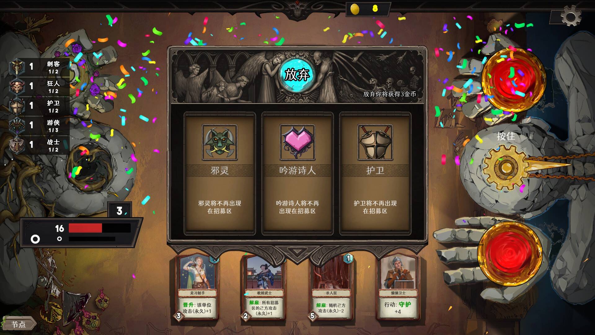 献祭可以用3金让1张卡牌的被动被手中任意1张其他卡牌继承,这个部分的意义主要在于加速养爹,比如你给1张解雇永久增加攻击力的卡牌附加上刷新商店永久增加攻击力的效果,那么它的成长速度就足以帮你解决流程中的输出问题。