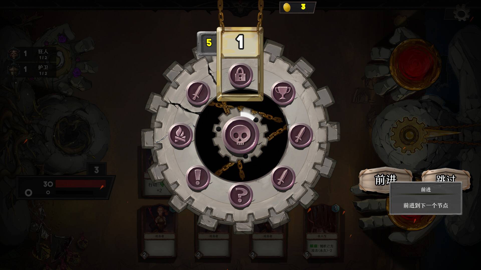 当然从我的尝试来看,本作的BOSS战拥有相当高的强度,玩家需要在最终进行挑战之类累积足够强大的战力——也就是牌组,为了达成这个目的,我们需要在一个“轮盘”风格的地图上不断向前推进,其中包含了战斗、特殊事件、木偶、祭坛、篝火等地点——这些内容是随机生成的,也构成了重复可玩性的一部分。