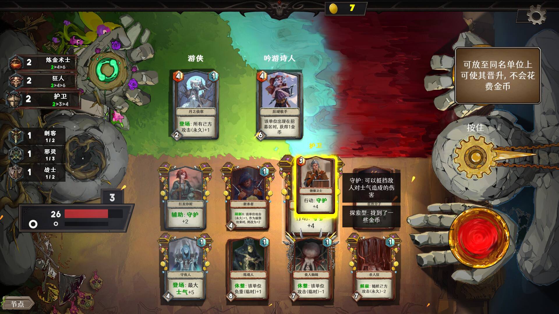 攻击力养成的途径还是比较多样的:在本回合不攻击、攻击、招募新的随从、解雇随从、献祭随从、刷新商店等方式都有可能获得临时或者永久攻击力的增加,这也给了前期过度卡一定的存在价值,比如刺客系的贼能力是商店每8次洗牌永久攻击力+1,这个能力通过献祭传递给其他卡会增强为商店每8次洗牌永久攻击力+2,那么如果开局能刷到贼,完成能力的传递,这张卡也有作为主力培养下去的价值。
