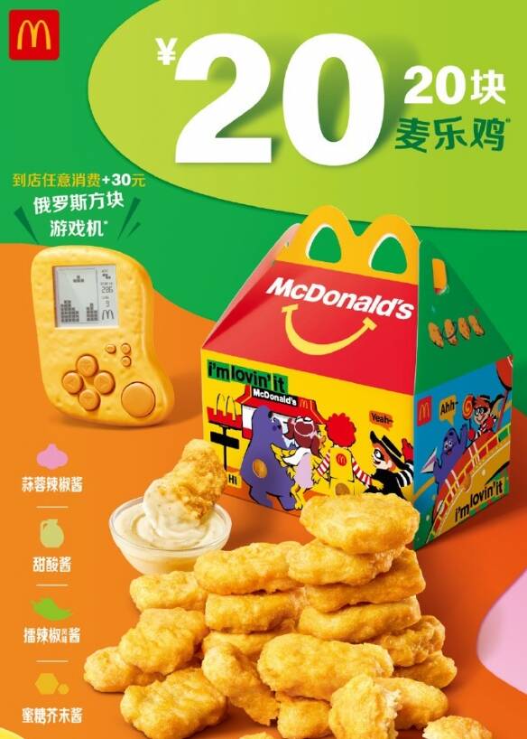 今日据悉,麦当劳推出六一活动,任意消费+30元可兑换麦乐鸡块造型的俄罗斯方块游戏机,仅能玩俄罗斯方块一款游戏。目前活动非常火爆,多地已售罄。感兴趣的观众们可前往了解。