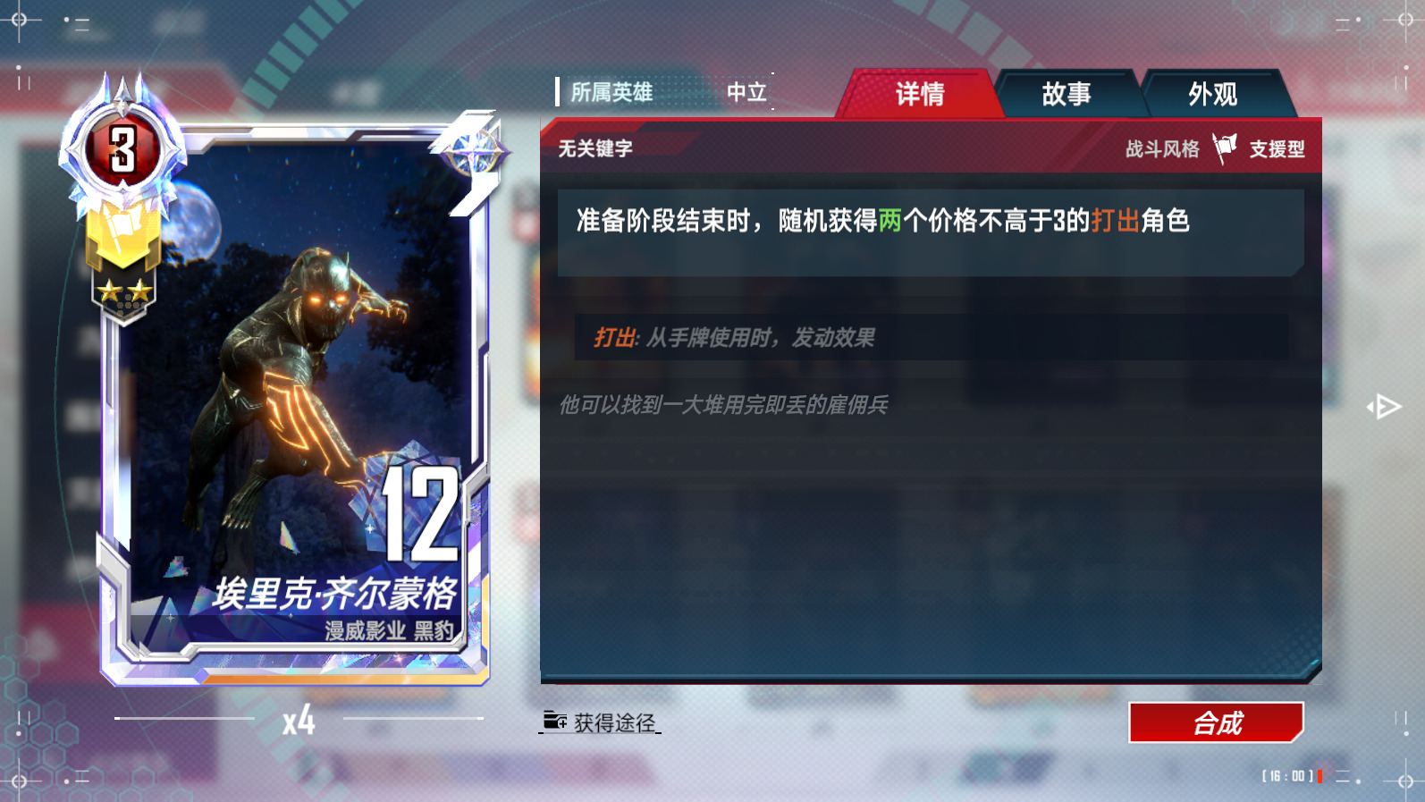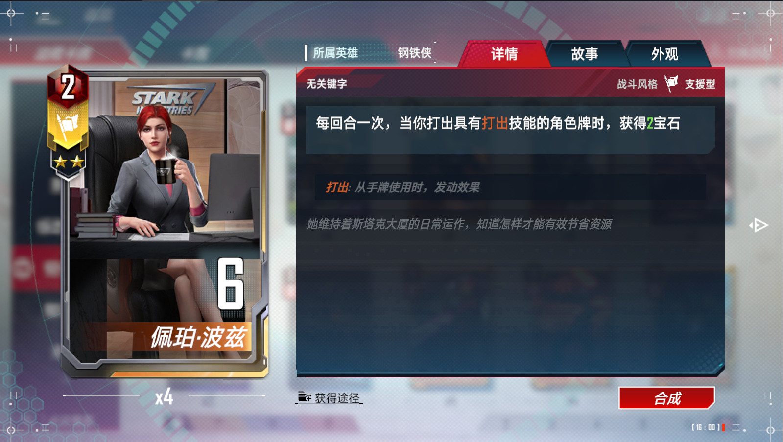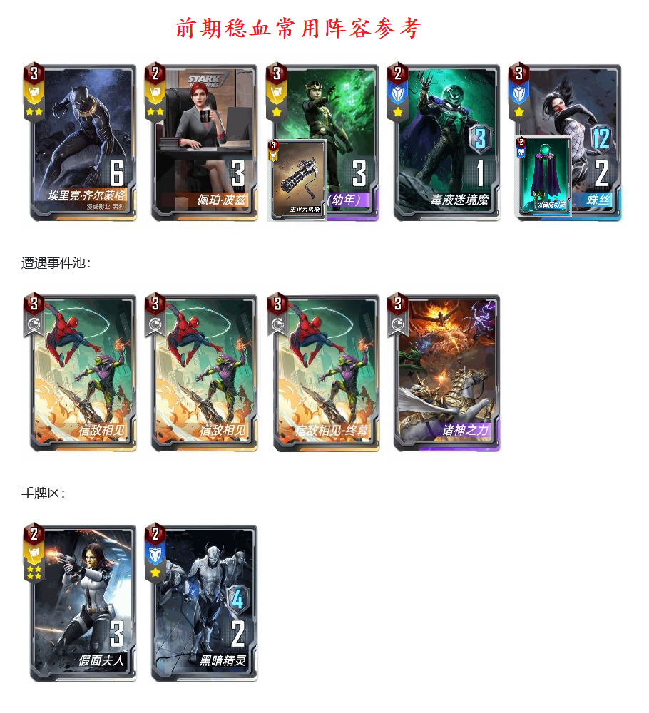 这个技能基本都可以回10血左右,本卡组带机甲便携箱也是为了在金钱豹一直不给钢铁侠角色的时候,多一个拿到钢铁侠角色的机会,使用该技能必须要把手牌搞到10张以上,然后打出钢铁侠单位,使用本技能即可回血10以上(数值等于钢铁侠回手以后的手牌数量)