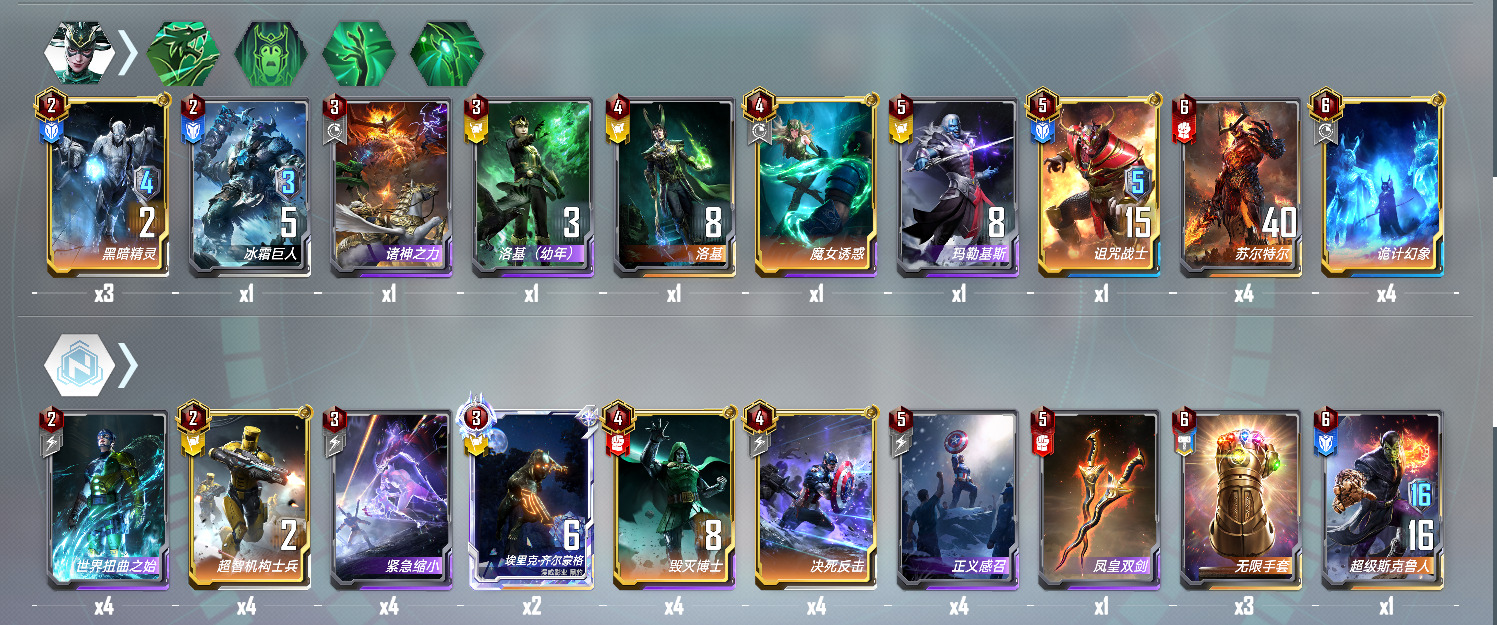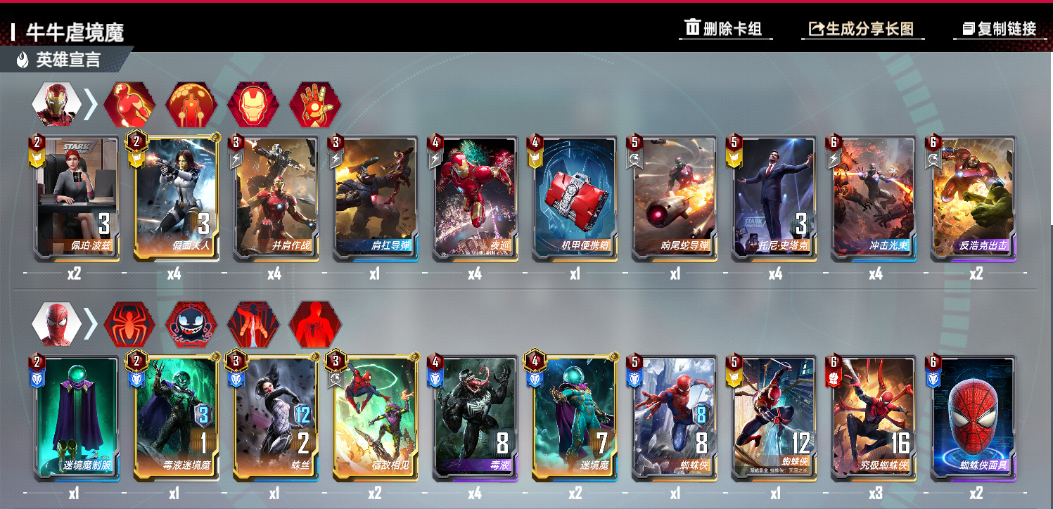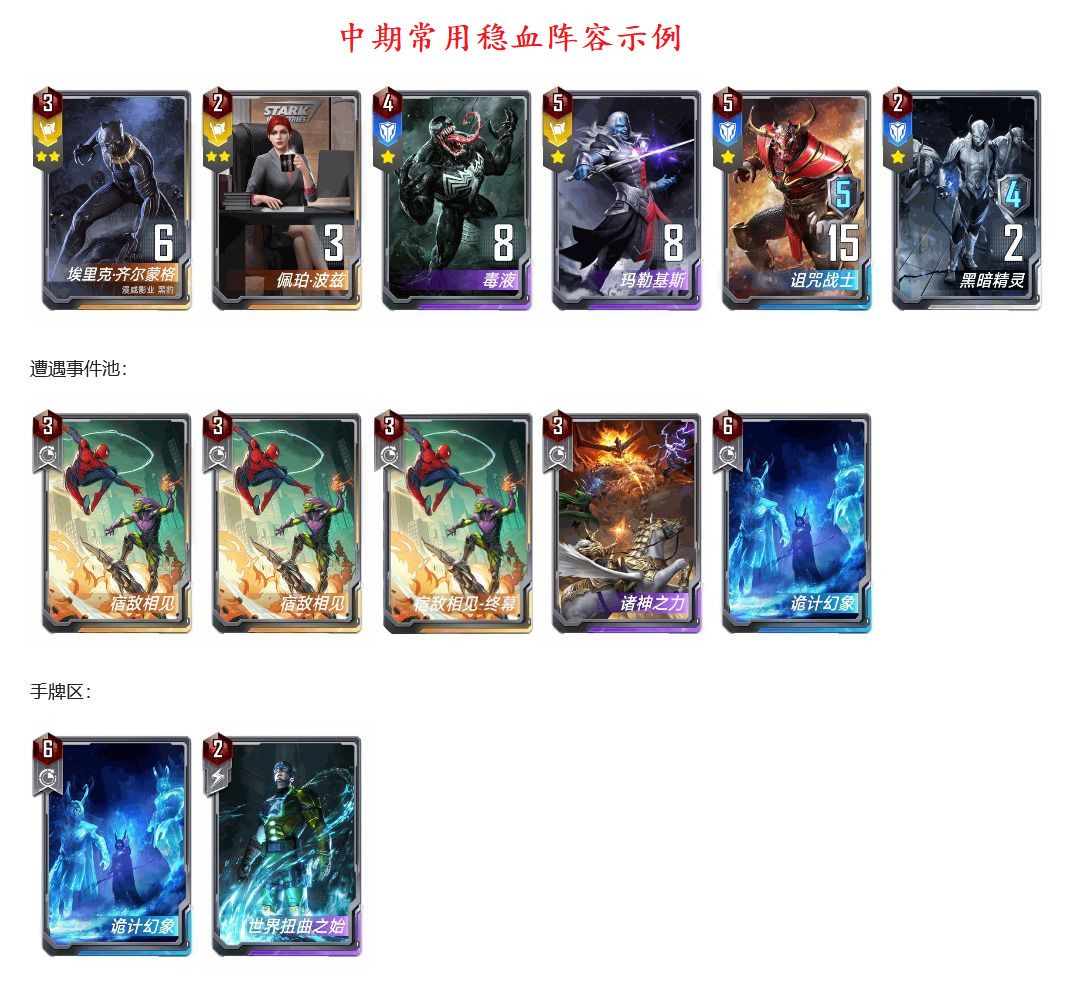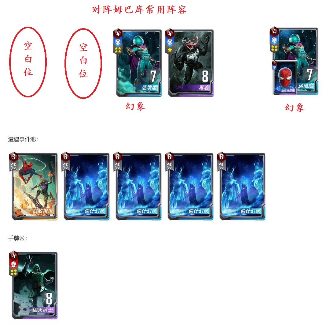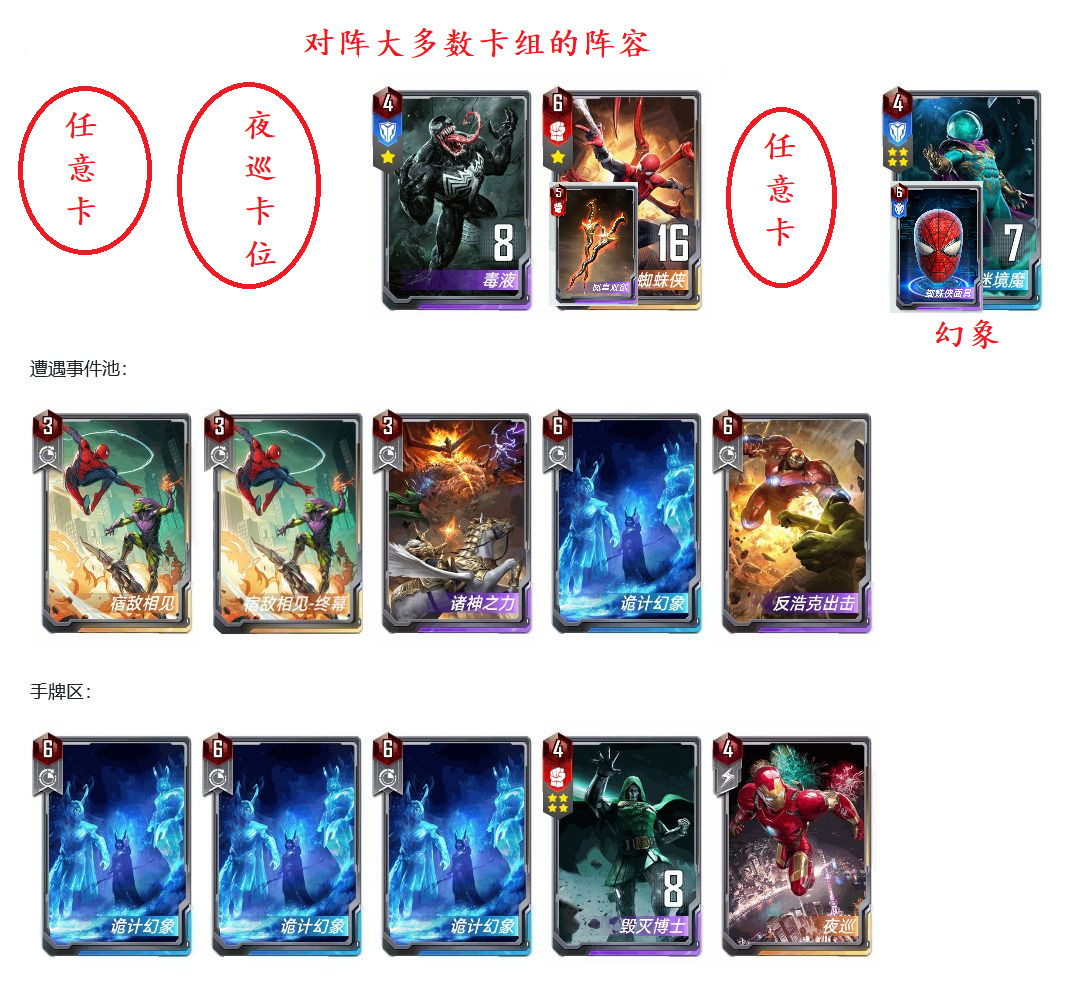 大部分情况下,当前的版本只需造一个4星或者八星幻象迷境魔就行了,剩下的卡位用垃圾卡填充,比如究极蜘蛛侠和4费的毒液,在有八星秘境魔的时候,场上放三个随从,只要保证不会被群杀一次干完即可,八星即可变全场。