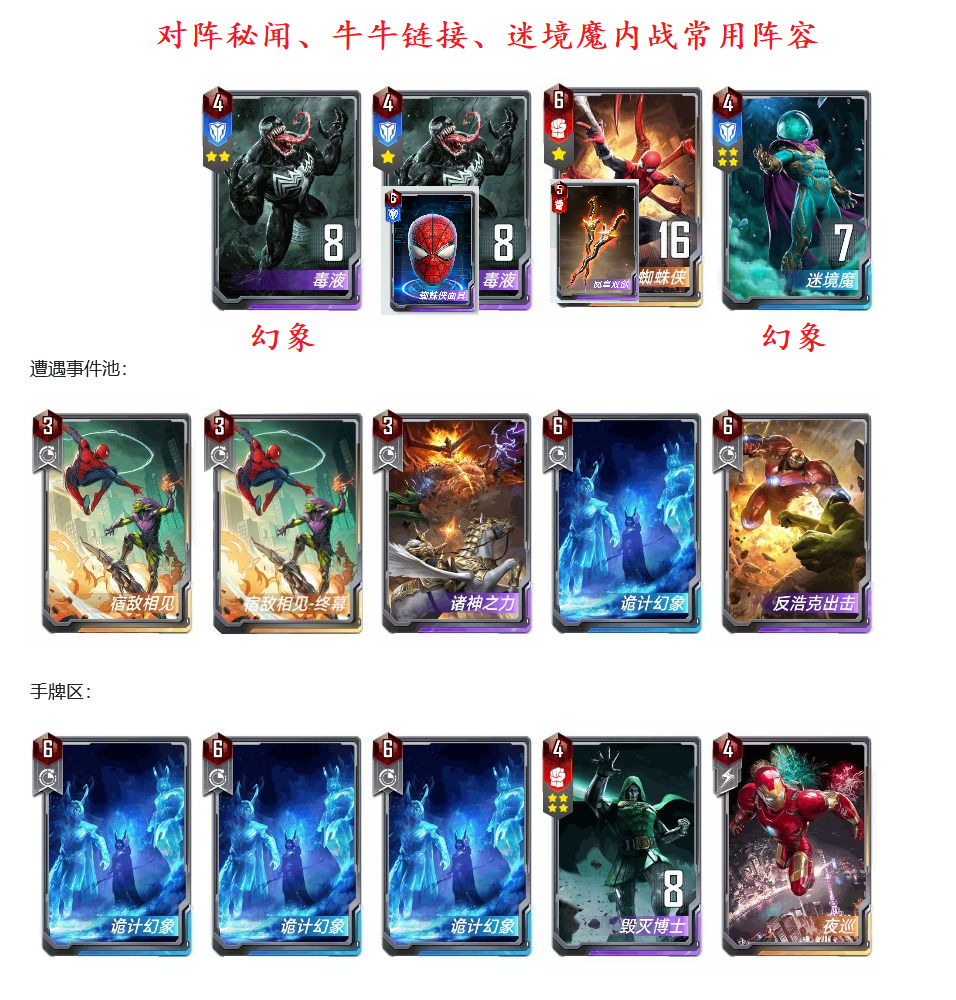 如果打牛牛链接、秘闻、秘境魔内战等需要长期耗的卡组,则需要多造一个4费毒液的幻象(前提是有蜘蛛终幕),决赛打秘闻的时候场上只能放四个随从,一个群杀过后即可立即触发诡计幻象,10个群杀以下一般都死不了;