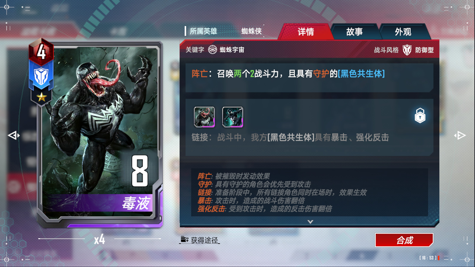 在商店有并肩作战的时候,卖掉事件池的宿敌相见,重复操作后,我们可以快速获得蜘蛛终幕,是前期锁血的方式之一,本卡组也带了几张4费的毒液,也可以作为中期优质的锁血方式之一;