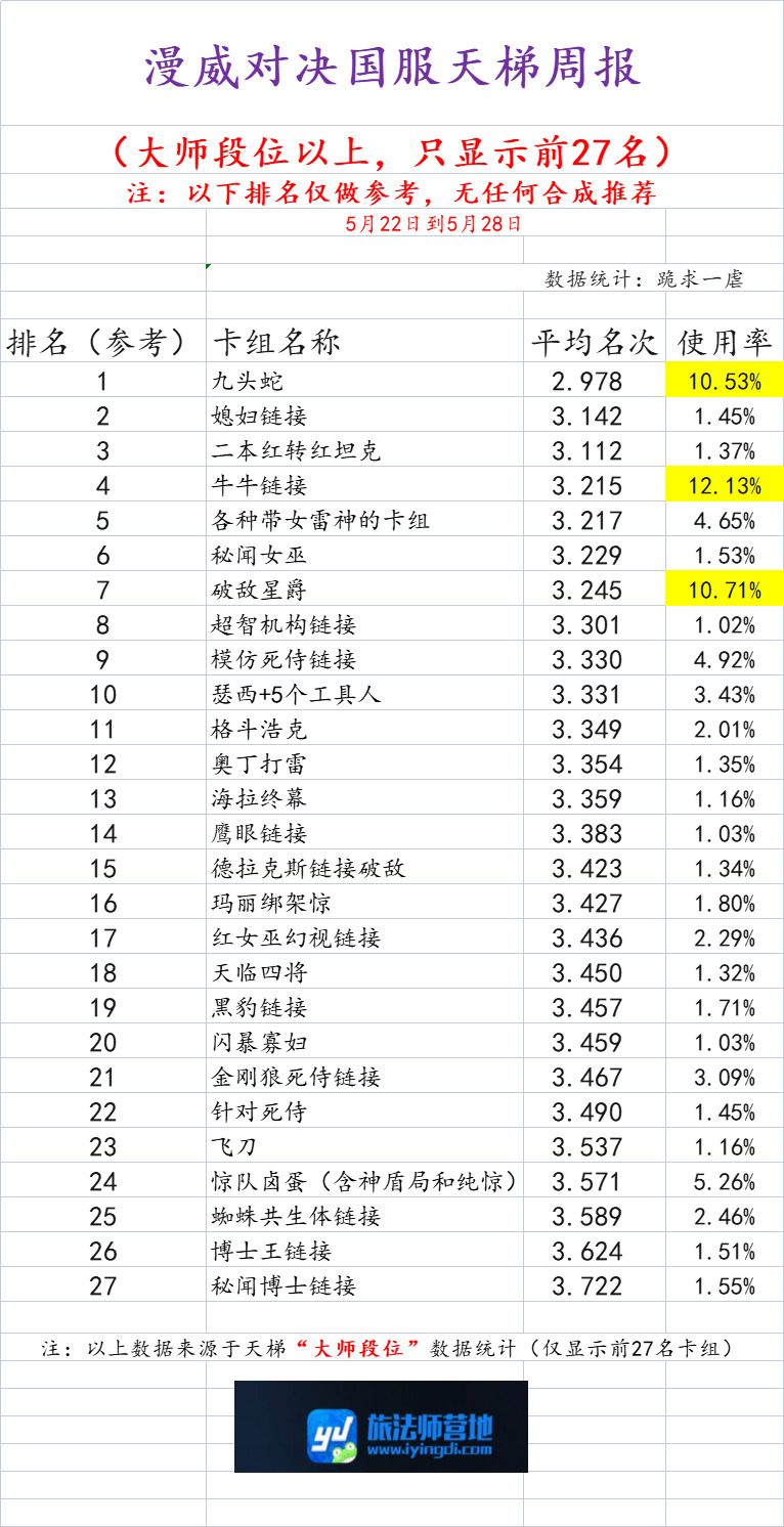 本周报数据仅做参考,不代表卡组在“动态天梯”的适应性,不做任何卡组推荐、合成: