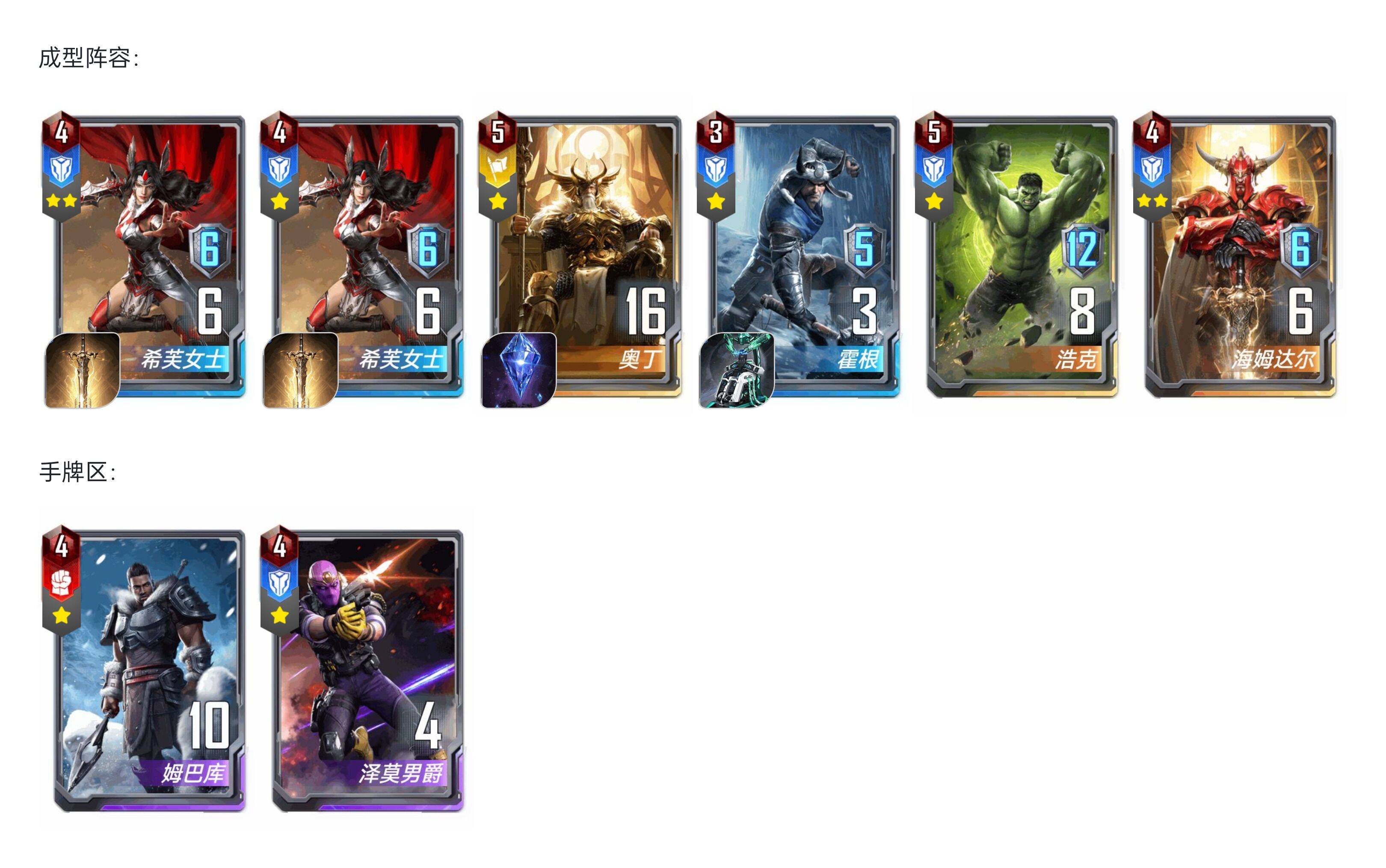 中期上姆巴库,后期6本搜反浩克,上高星的奥丁来克制。胜率低。
