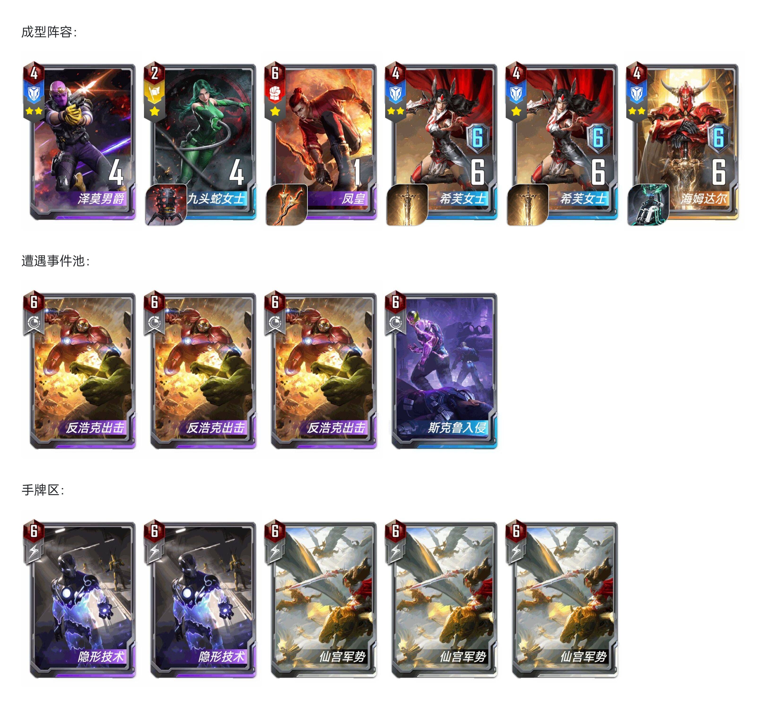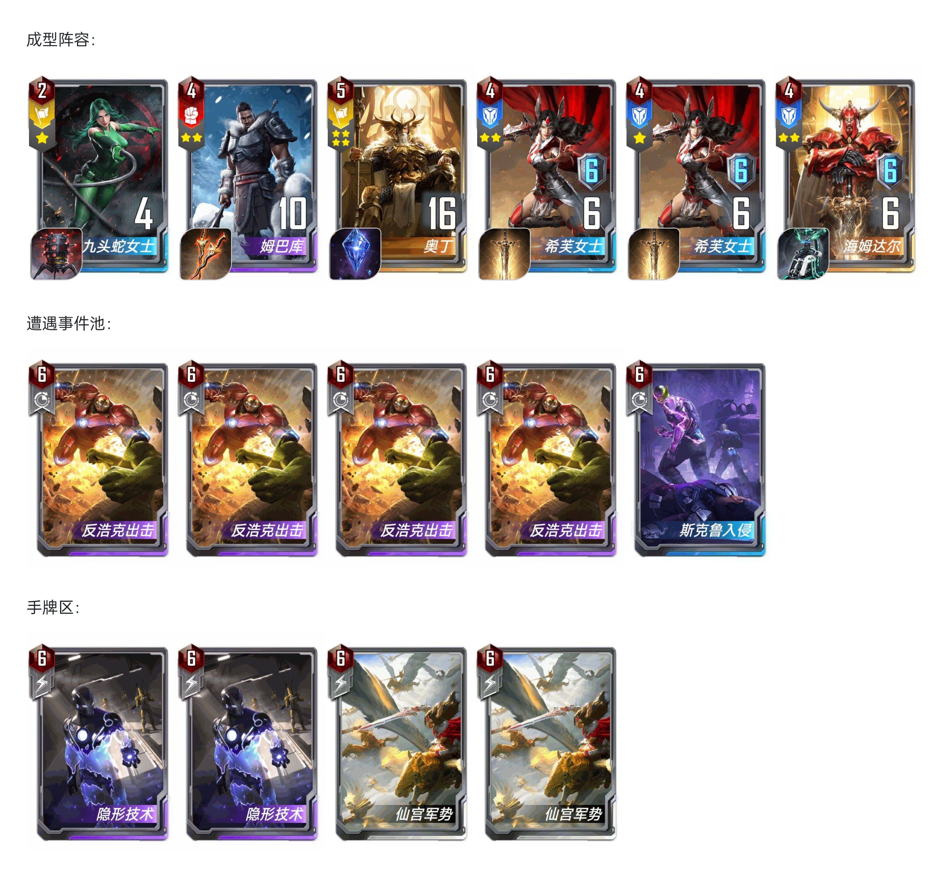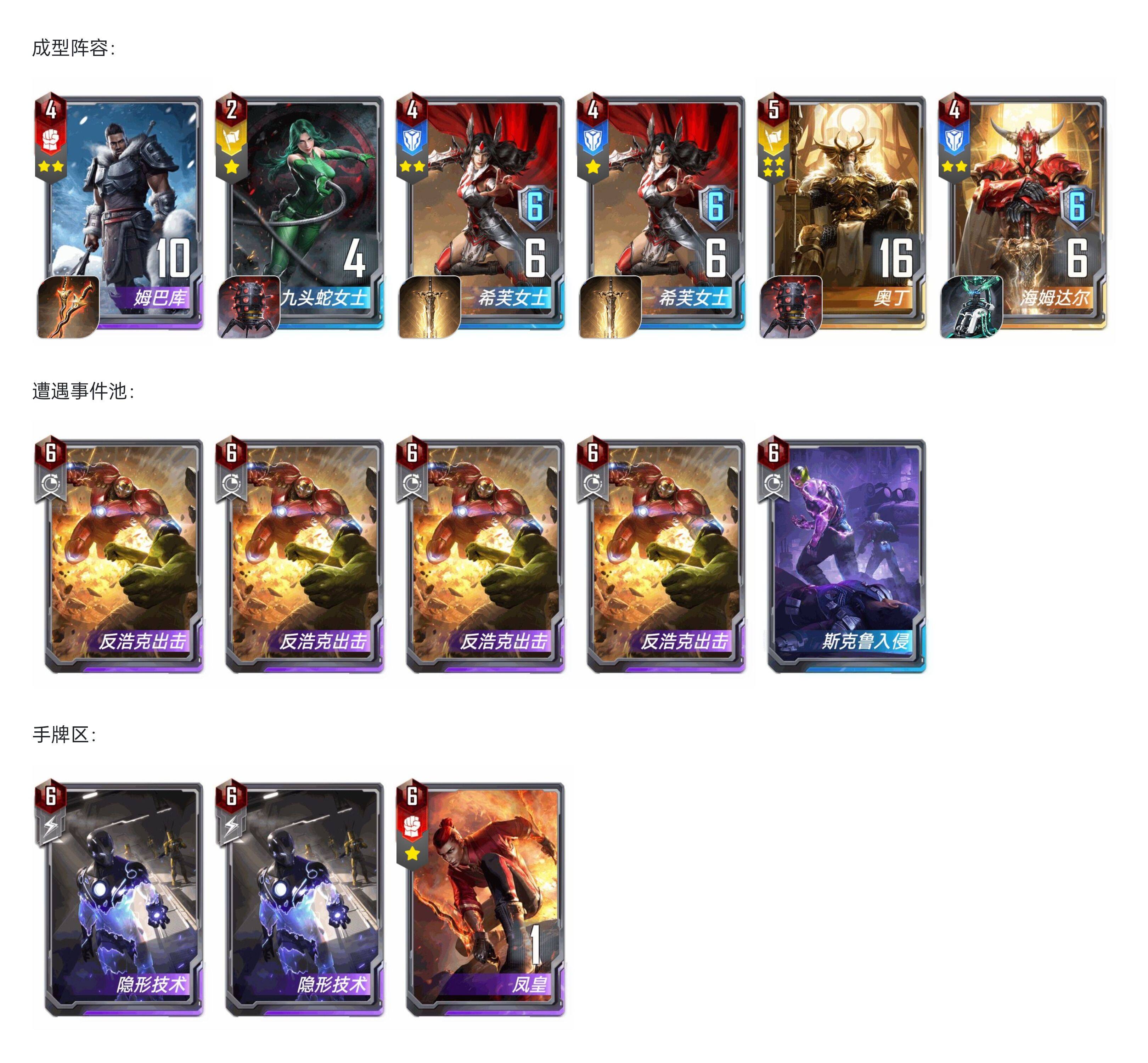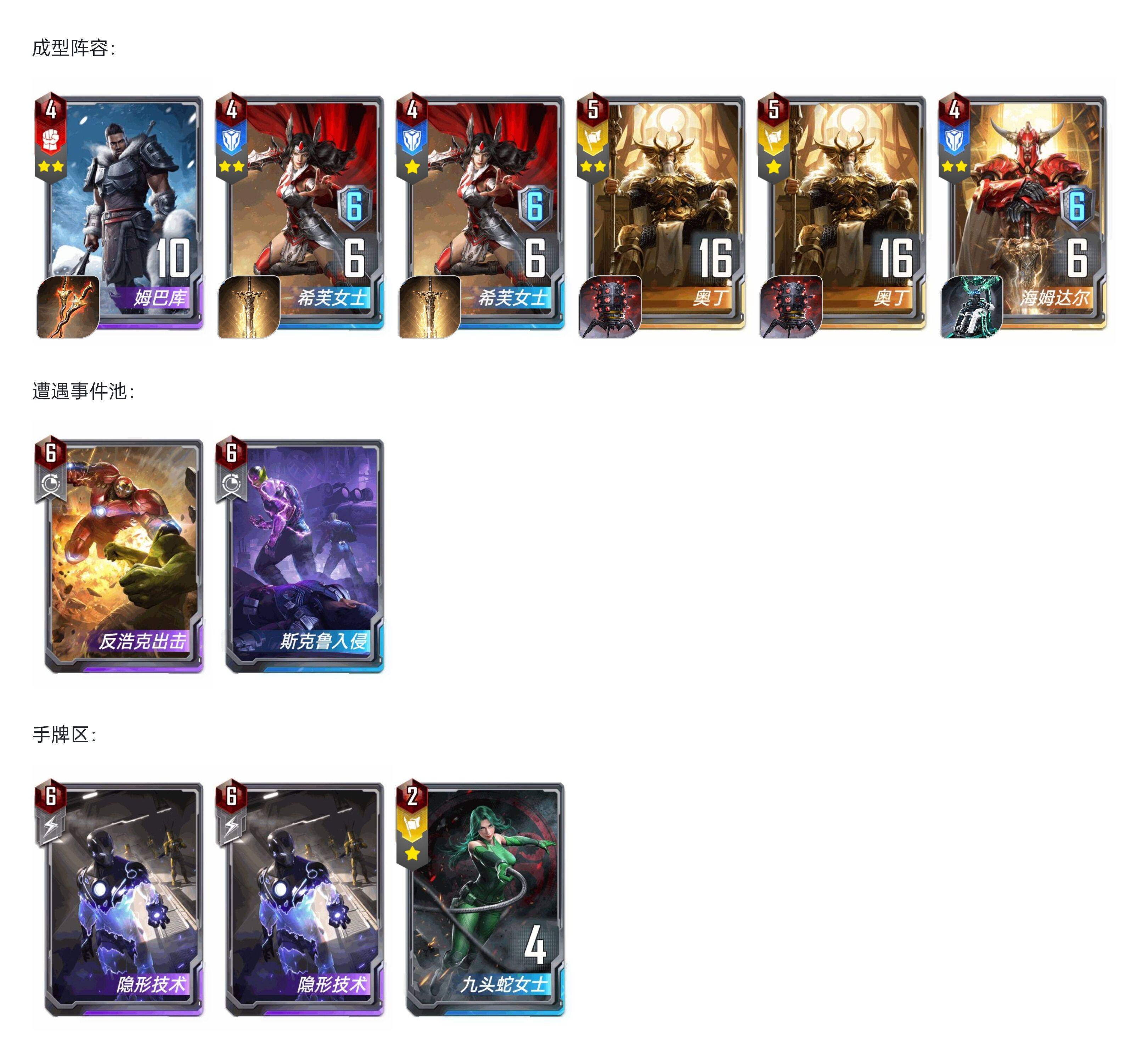 此阶段观察场上其他人玩什么,有牛头人或九头蛇的话,要拿姆巴库(摧毁幻象事件/九头蛇事件)+泽莫(变精灵/女士),有蜘蛛瑟西的话,拿姆巴库(摧毁反浩克事件)。