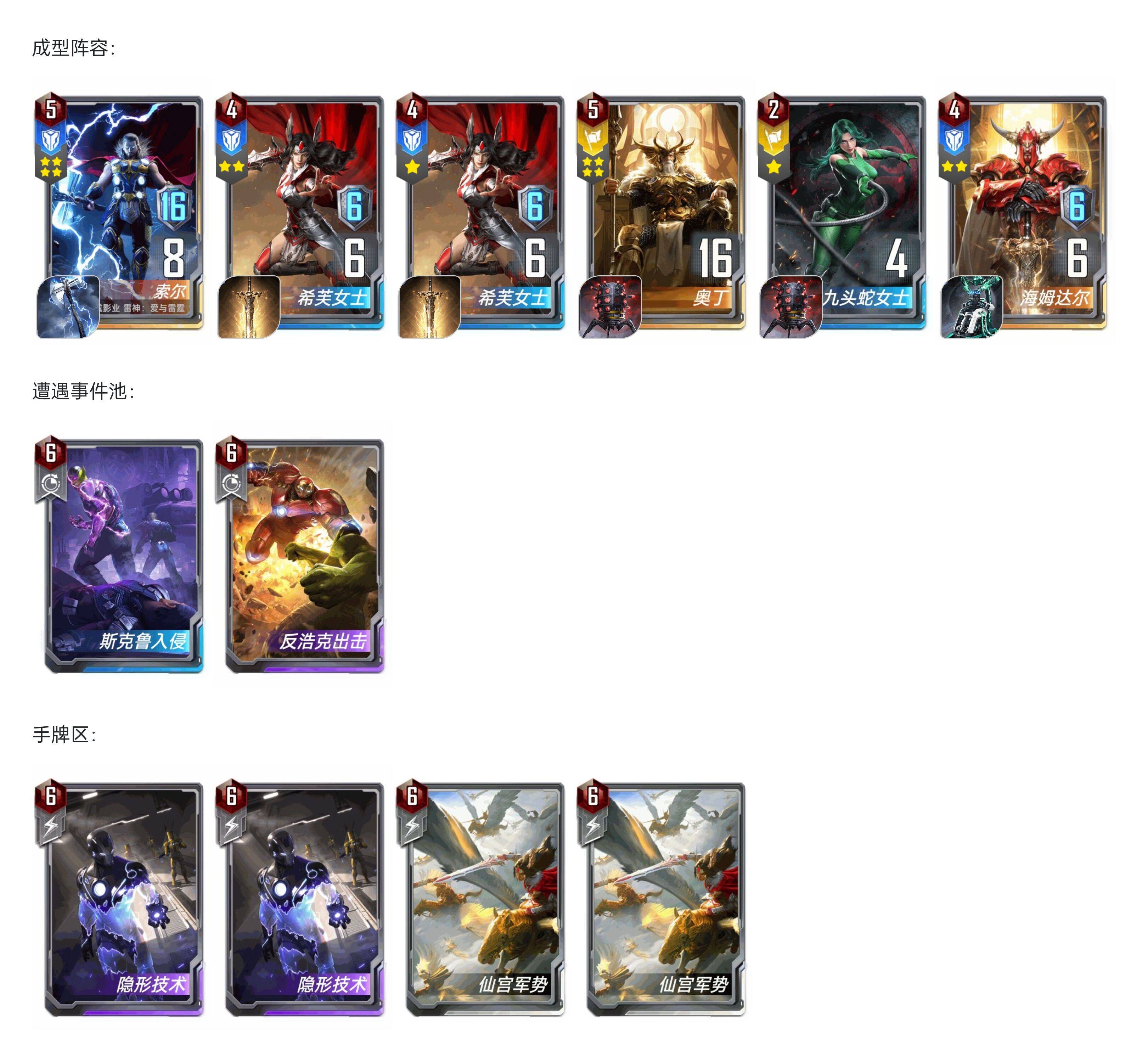 4,第5~7回合,停4本搜3星希芙。开了仙宫三勇士链接的话,每回合尽量首次打出4费仙宫牌来摸闪电护身,这卡对希芙涨战力也有帮助。通常7回合能搜齐3星希芙,那么上5本找奥丁,绿浩克。