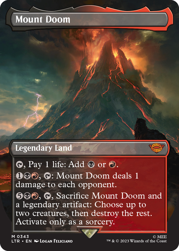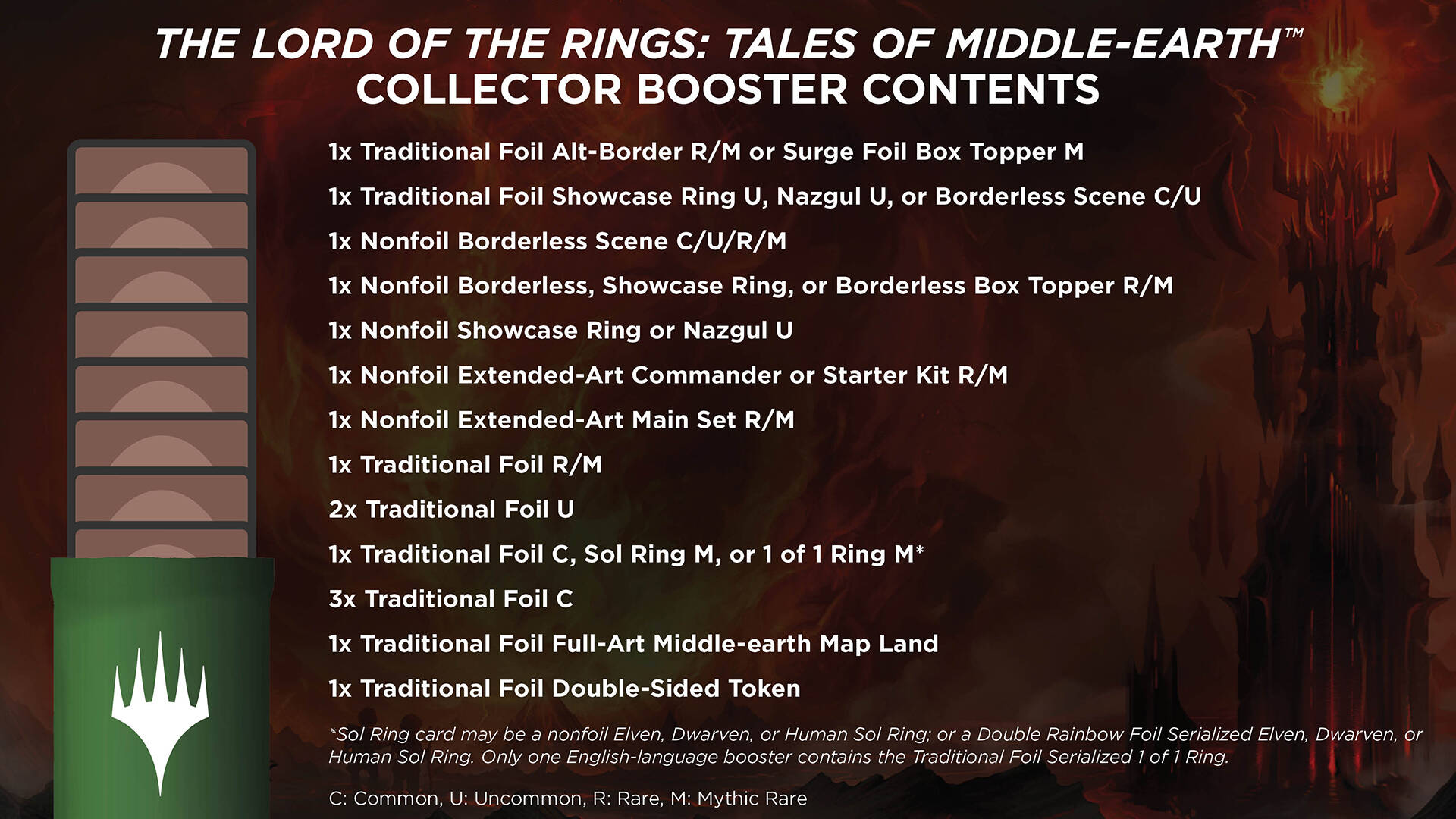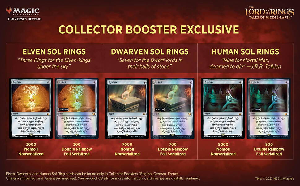 这些牌都是重印的神器和地牌,共30张,搭配了魔戒皮肤。这些牌的所属系列为LTC(魔戒指挥官),因此重印不改变赛制合法性。系列、轮抽和聚珍补充盒中内附一个盒顶赠卡包,其中包含一张传统山的王国和遗宝。