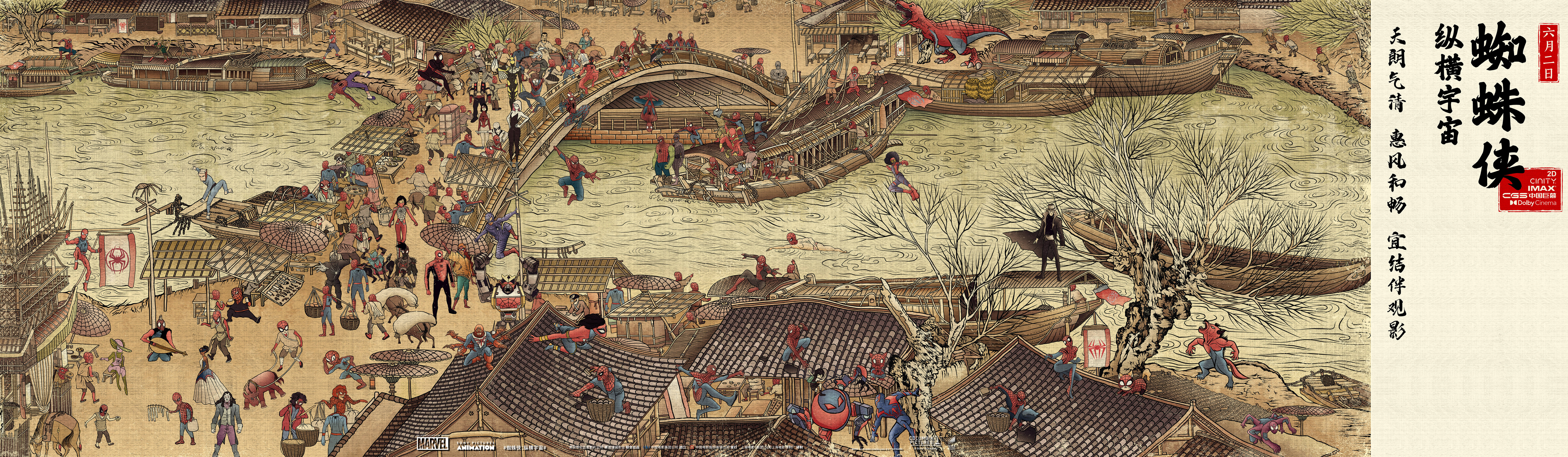 动画电影《蜘蛛侠:纵横宇宙》今日发布了全新的中国独家艺术海报,整体画风宛如蜘蛛侠版的清明上河图。