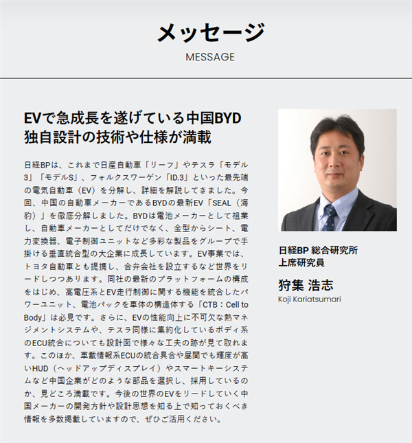 近日,日本规模最大的出版社日经BP社,在其官网上公布了拆解比亚迪海豹汽车的消息,并宣布将拆解比亚迪海豹汽车的全过程、结果,将编辑成文字、图片、视频、书籍等多种媒介形式,并于2023年9月15日公开发售。