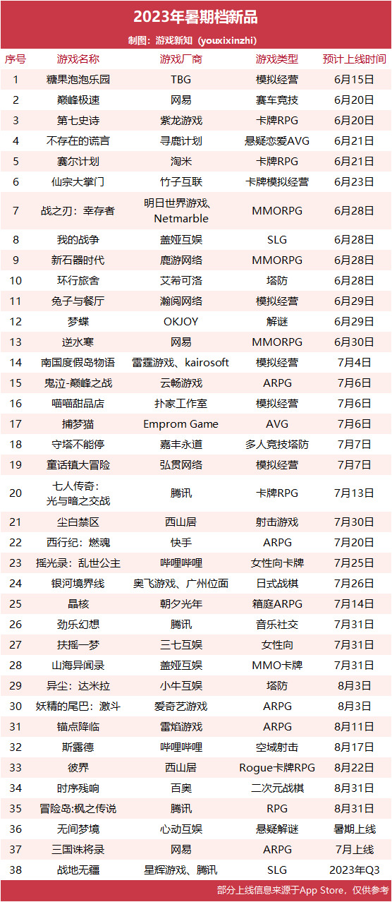 游戏新知根据App Store商店页和网络信息整理了一部分预计在6~8月上线的产品,数量比去年同期稍微更多一些。今年腾讯、网易、哔哩哔哩等大厂均有产品上线的计划,有的游戏在最近还在进行测试,为正式上线做最后的准备。
