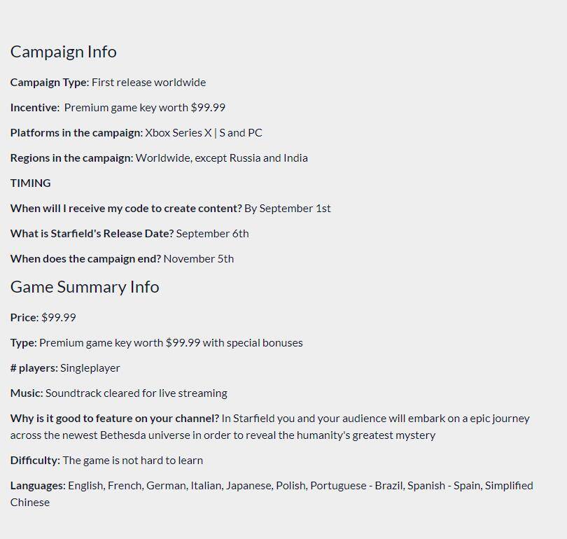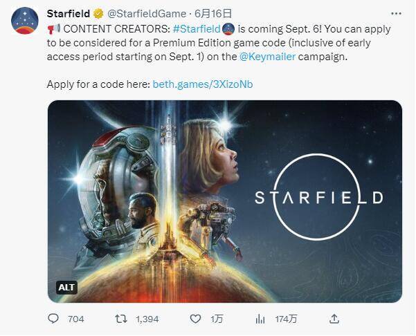 《星空》官方推特宣布,将从9月6日~11月6日与“keymailer”进行联合活动,内容创作者可以在活动中申请获得《星空》数字高级版的游戏Key,在9月1日即可提前进入游戏。