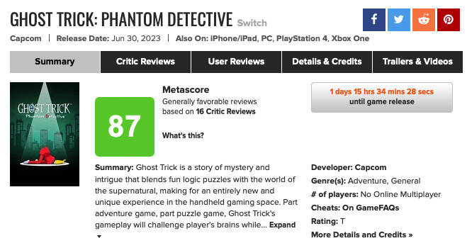 《幽灵诡计》Nintendo Switch版本MC站媒体评分今日公开,目前根据多家媒体的评分结果为均分87分。