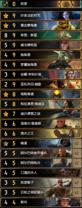 3.巨熊群岛:优势对局,key牌数都数的过来,弗卡夏,斯瓦大熊,梅陆辛,西格瓦尔德,无情者和仪式,其中最关键的就是大熊,西格瓦尔德和梅陆辛,能直接叶奈法拿一个就可以躺着玩了。
