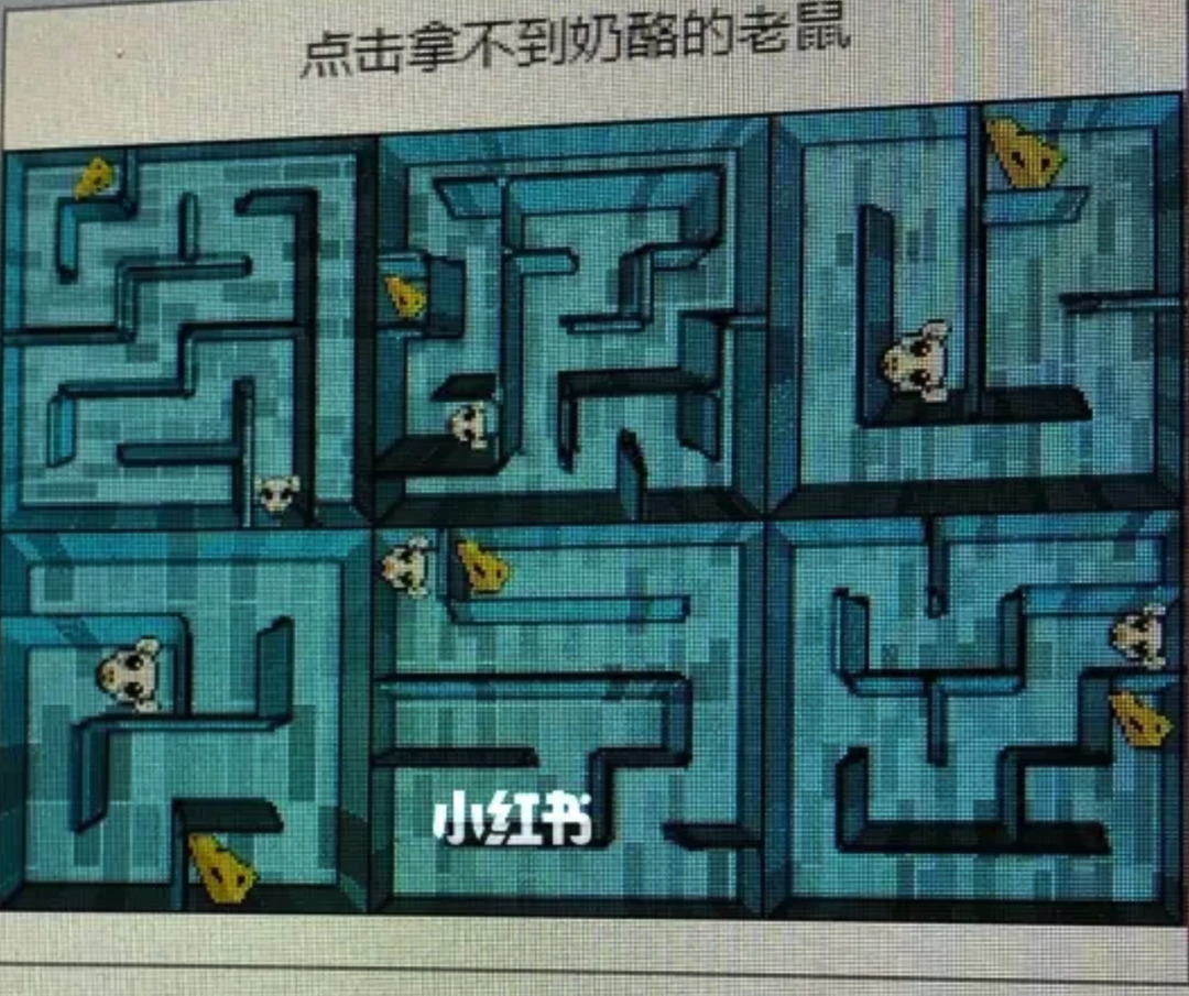 还有的干脆给你画 6 个迷宫。每个迷宫都有老鼠和奶酪,让你找到那个吃不到奶酪的老鼠。