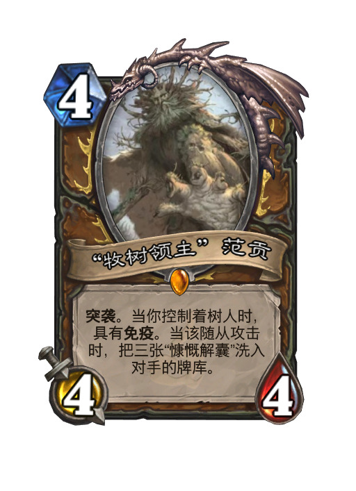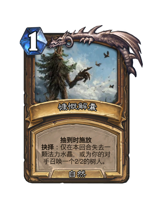 *当对手在你的回合抽到“慷慨解囊”时,如果他有剩余的法力水晶,则会自动随机选择一项;如果他没有剩余的法力水晶,则会自动触发“召唤一个2/2的树人”。
