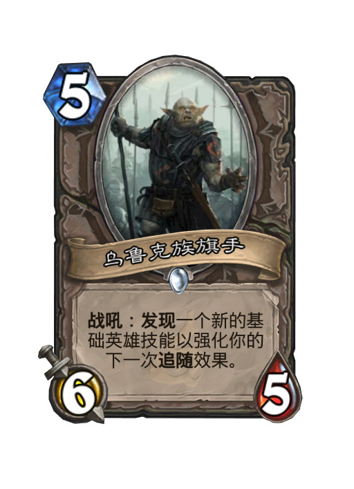 *触发“乌鲁克族旗手”的战吼效果后,你的下一次追随效果会额外触发一次你发现的基础英雄技能效果。这并不会替换你目前的英雄技能。