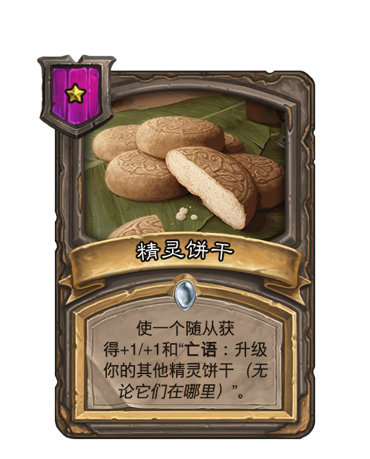 *“精灵饼干”的效果可重复叠加。如果你的随从贴有两个“精灵饼干”,当升级效果触发时,该随从会立即获得+2/+2,且亡语会触发两次升级效果。“精灵饼干”获得的额外效果同理。