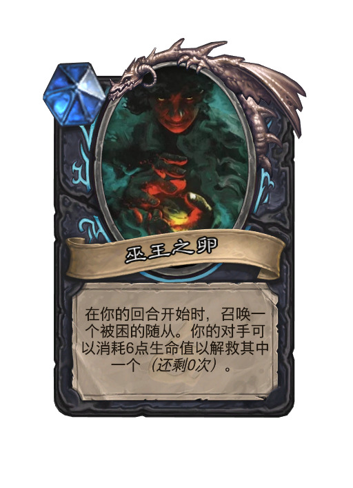 *在对手的回合中,他可以点击你的“巫王之卵”并消耗6点生命值来为自己随机召唤一个被困的随从。这些随从在被召唤的回合无法立刻攻击。